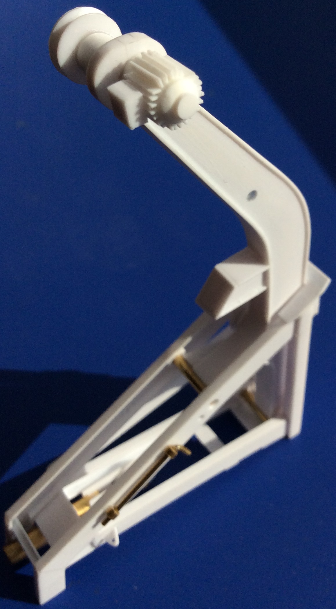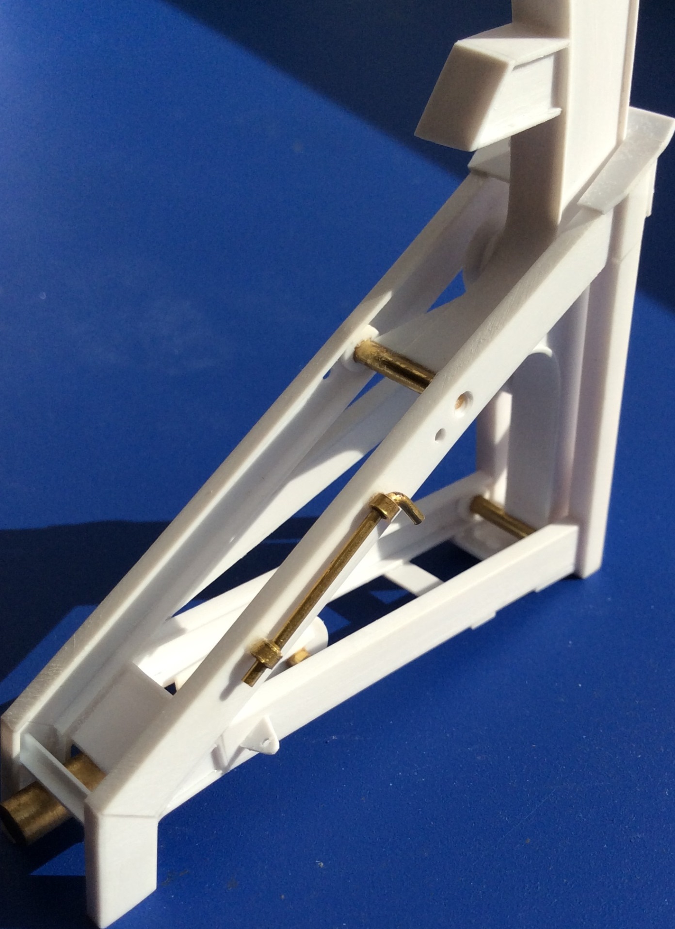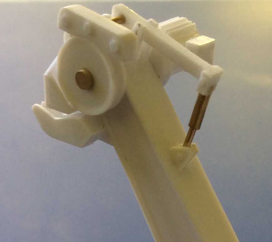 Dzięki Wojtek. W między czasie zrobiłem "przeguby" do dźwigu z mosiądzu. Ponieważ nie posiadam walcarki to musiałem sam sobie wyprodukować płaskownik 2x1,5mm (drut, pilnik i jechane z koksem z ręki), który był jednym z elementów przegubu. Do tego wytoczone podkładki mosiężne i reszczte zalatwilo lutowanie. Efekt widać poniżej: