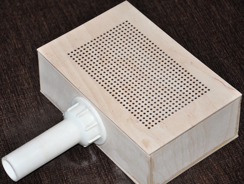W tym tygodniu otrzymałem od Romanova wypaloną laserem sklejkę formatu A5 do urządzenia formowania próżniowego (główna płytka z otworami). Resztę sobie dociąłem brzeszczotem i oto powstała moja maszynka. Zastosowałem również kawałek rurki od zlewu, która doskonale średnicą pasuje do rury od odkurzacza. Montaż na śrubkę.