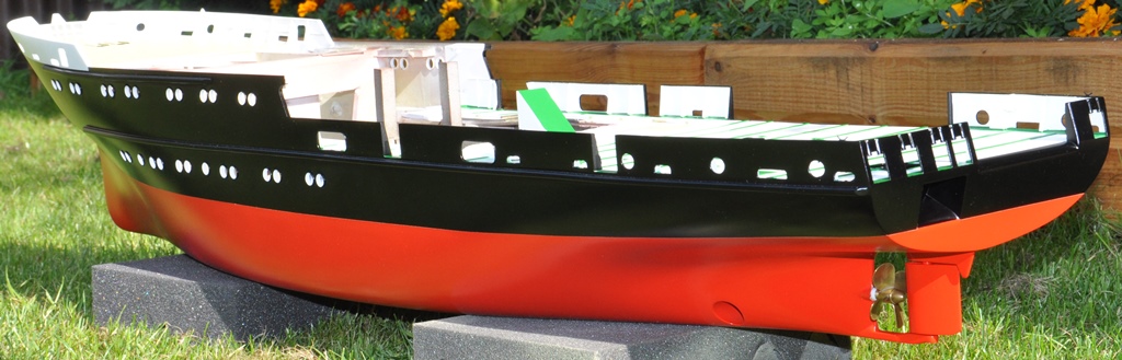 Pokład zimą będzie obklejony deseczkami jasnego forniru. Teraz muszę zrobić ściany pokładu dolnego aby móc dalej malować pokład górny, na który nachodzi nadbudówka...