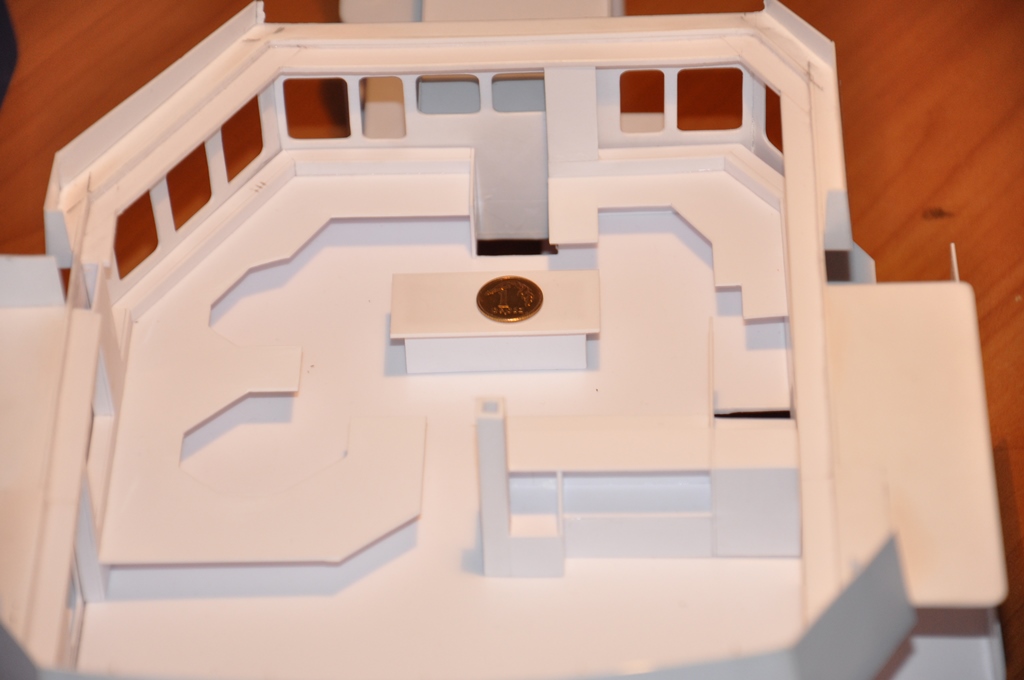 Z początku sterówka miała być w całości zdejmowana, ale po przeanalizowaniu za i przeciw, postanowiłem ją skleić do reszty i wykąbinować zdejmowany dach. W samej sterówce trwają prace nad omeblowaniem, które będzie oklejone fornirem, aby całość wyglądała sympatyczniej.
