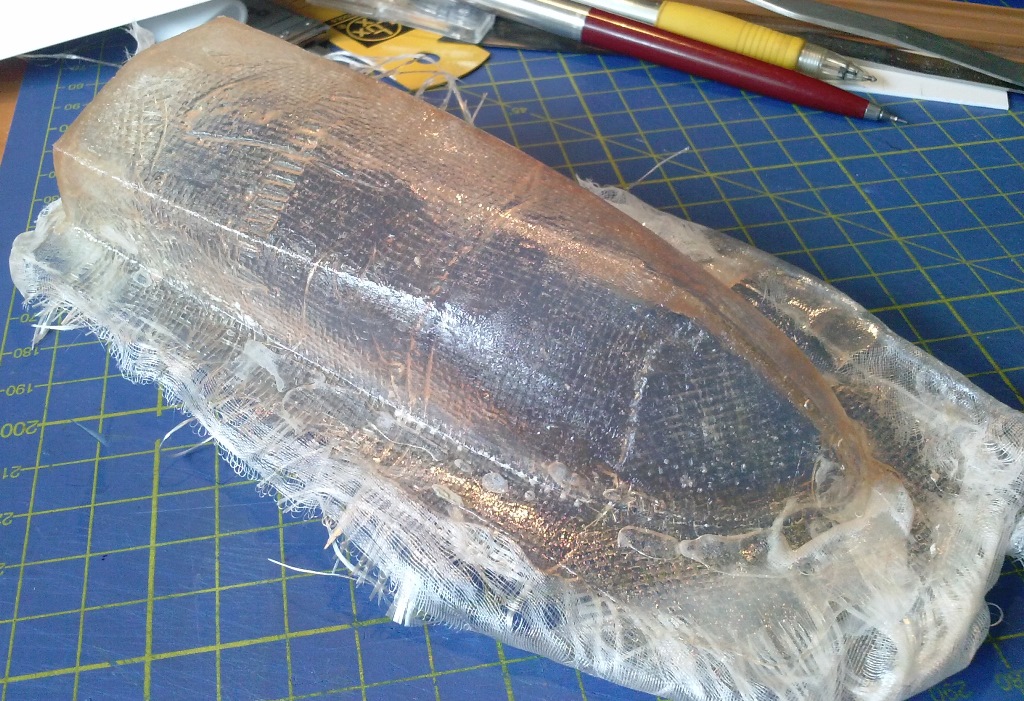 Wczoraj wieczorkiem postanowiłem wyprodukować z płótna szklanego i żywicy poliestrowej pierwszą z dwóch szalup (w sumie bardziej spody pod małe motorówki) ratunkowych. Wcześniej pokazałem zrobioną formę z gipsu budowlanego, którą najpierw wysmarowałem cienką warstwą bezbarwnej pasty do butów a natępnie użyłem 2 warstw, najpierw płótno 18g a następnie paski 140g. Całość jest bardzo lekka (co mnie cieszy) i zadowalająco wytrzymała.