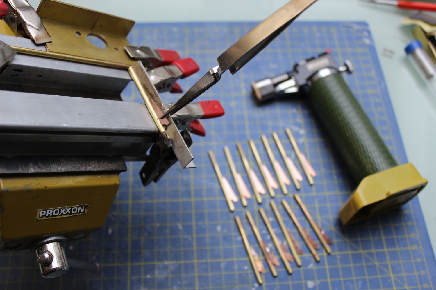 Tomek elegancki reling wysmyczyłeś, ale się tak zastanawiam dlaczego się meczysz z tym palnikiem , przy tego rodzaju elementach nie ma sensu używać palnika, bo jeden element chcesz polutować a drugi sąsiedni się rozlutowuje nie prawdaż ? do takiego lutowania wystarczy lutownica 80-100W .Palnik ja przynajmniej wykorzystuje jak nie mogę dostatecznie dobrze dogrzać lutownica element , staraj się tez lutując nie montować elementów które chcesz zlutować w imadła a jak już do odizoluj te elementy chociażby jakąś drewnianą „przekładką” a to dlatego ze całe ciepło które ma iść na podgrzanie elementu i dobre roztopienia spoiwa idzie w sobie właśnie w to imadełko i zwykła lutownica wtedy nie daje rade z dogrzaniem , palniki się doskonale sprawdza jak mamy do zespolenia np. dwa elementy „bielimy” cyna jeden i drugi dotykamy do siebie w miejscu w jakim maja być połączone i wtedy można tylko „smagnąć „ płomieniem z palnika i mamy już spoinę gotową a jak jest kilka elementów tak jak chociażby w Twoim relingu to moim zdaniem palnik jest tu nie wygodnym narzędziem i na pewno sporo się namęczyłeś , choć oczywiście to są tylko moje sugestie i uwagi