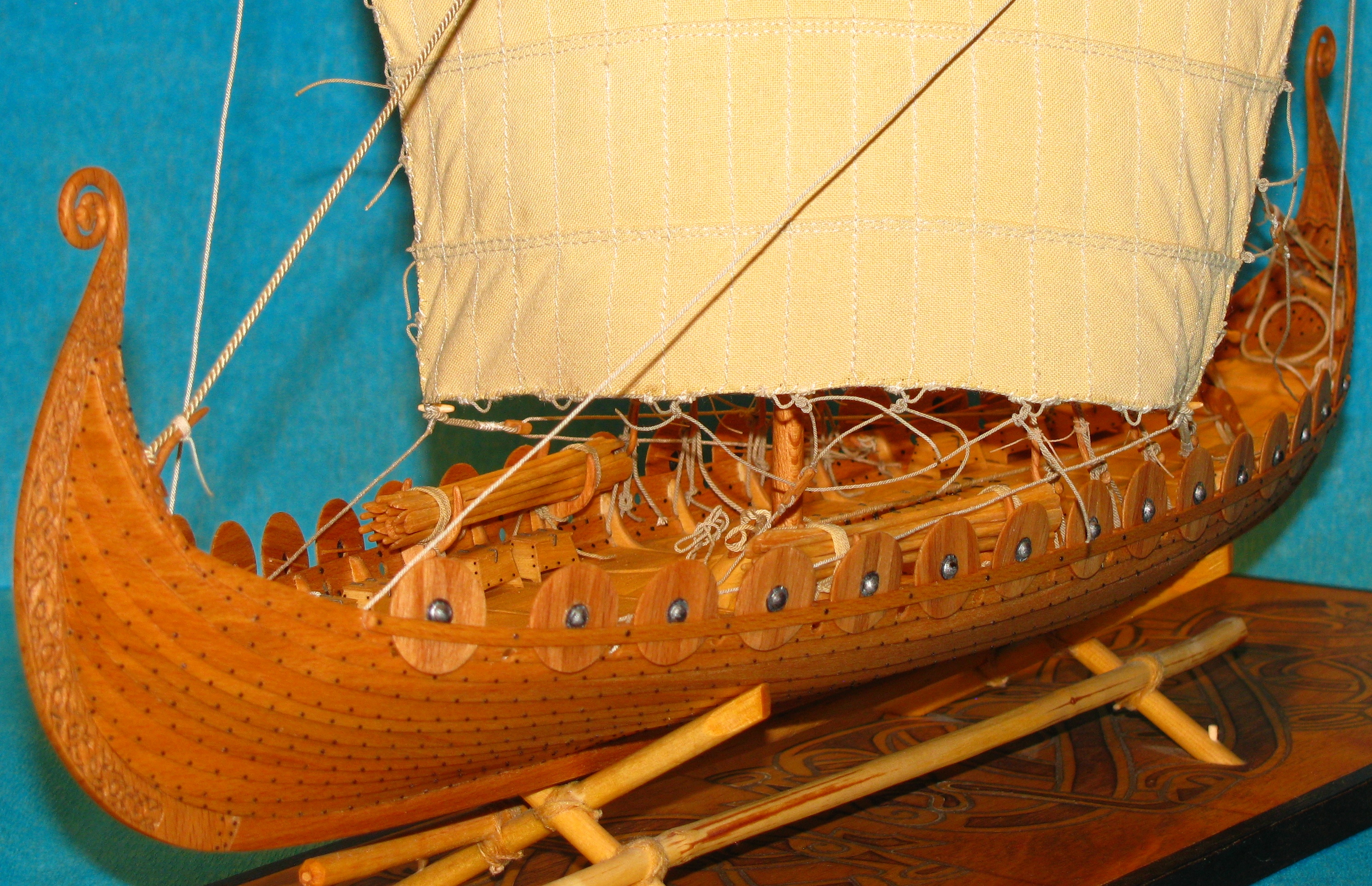 Kształt kadłuba w widoku z boku starałem się wiernie odwzorować, natomiast w przekroju poprzecznym na środku kadłuba nie jest zgodny z kształtem łodzi z Osebergu. Bardziej przypomina przekrój łodzi z Gokstad ale takie były plany z których rozpoczynałem budowę.
