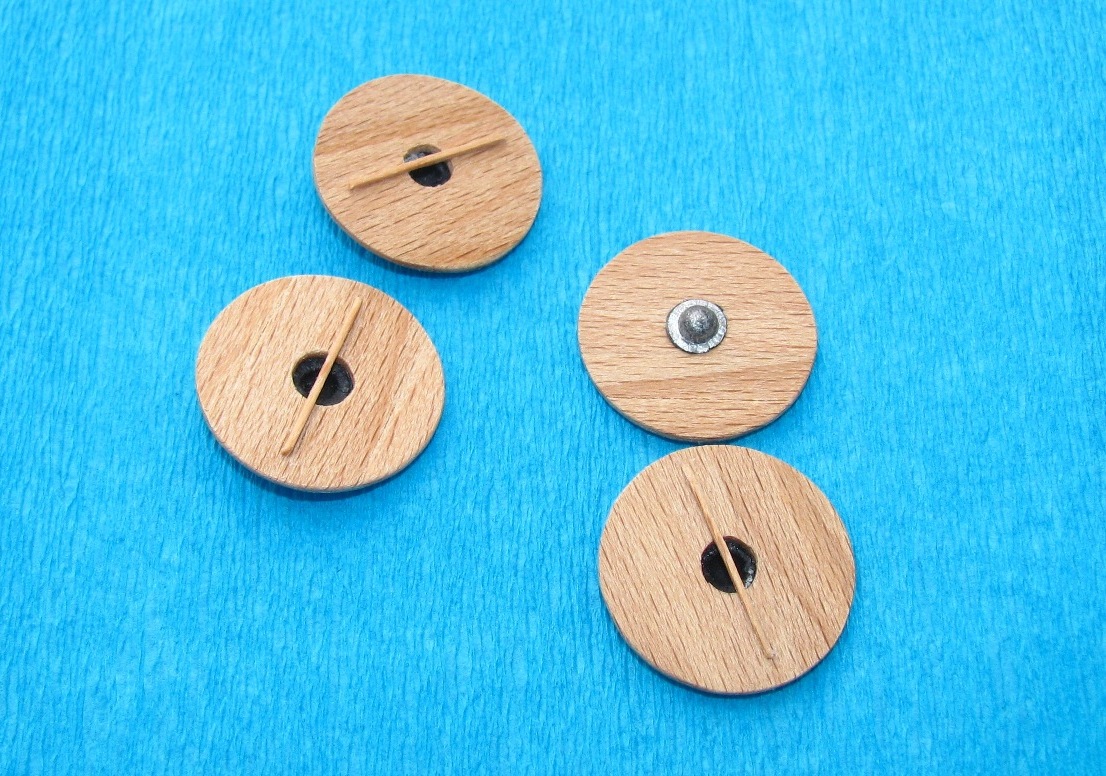 Tarcze zrobiłem, mimo oryginału, z dwóch warstw pasków forniru sklejonych poprzecznie i startych do grubości 1 mm. W rzeczywistości taka tarcza miałaby ok 5 cm grubości ale nie jestem w stanie wykonać ich cieńszych a na modelu nie widać przerysowania tego wymiaru. Potem wiercenie otworu i przyklejenie poprzeczki.