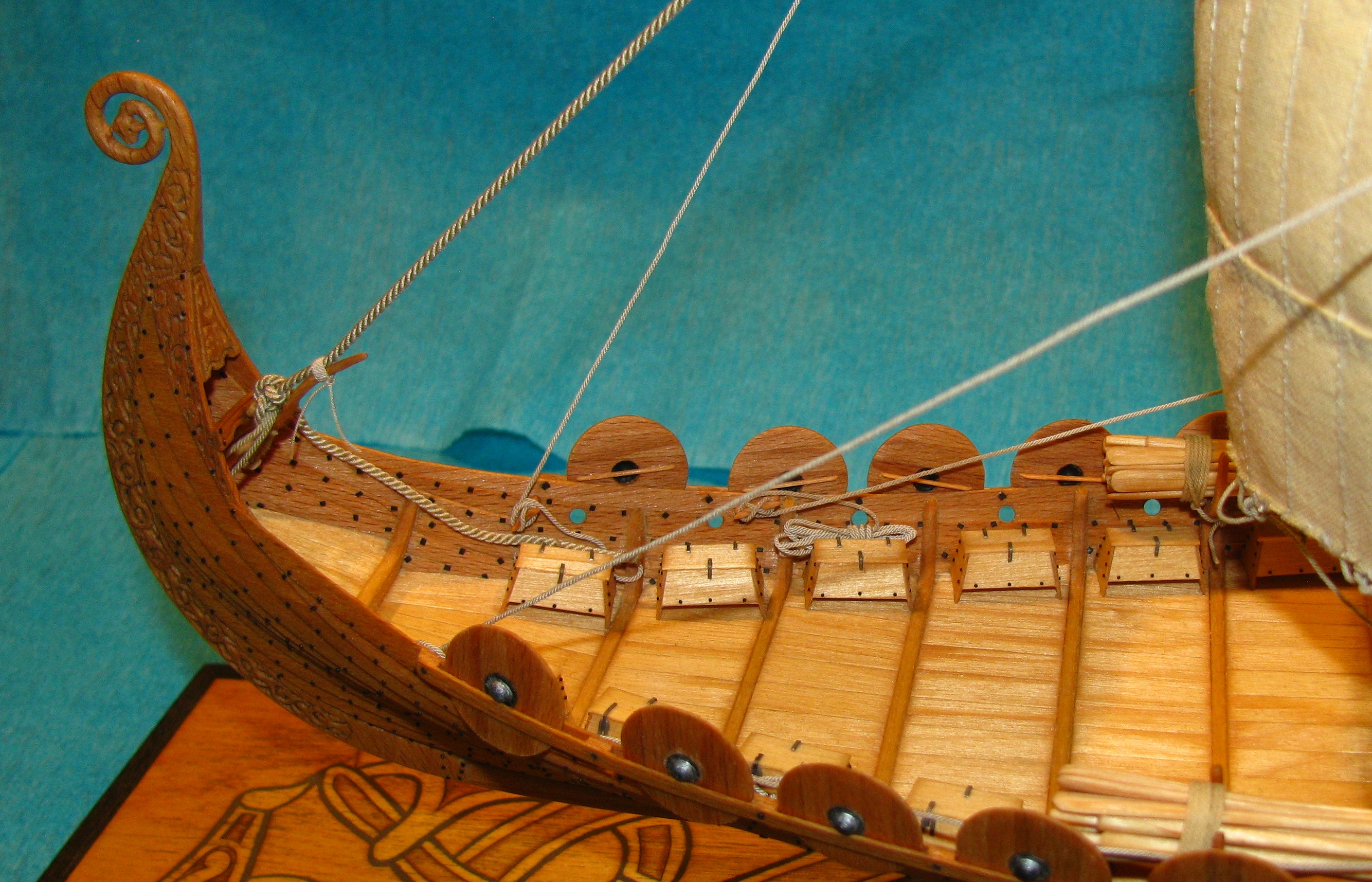 Kształt kadłuba w widoku z boku starałem się wiernie odwzorować, natomiast w przekroju poprzecznym na środku kadłuba nie jest zgodny z kształtem łodzi z Osebergu. Bardziej przypomina przekrój łodzi z Gokstad ale takie były plany z których rozpoczynałem budowę.