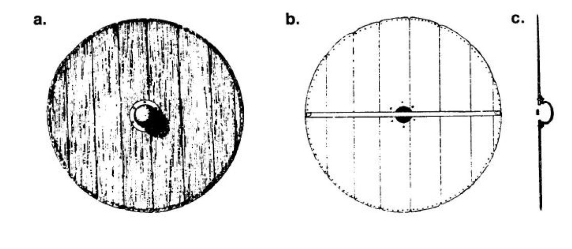 Według literatury Skandynawowie używali stosunkowo niewielkich tarcz - miały one kształt koła o średnicy zaledwie około metra. Ich grubość też nie była duża ok 3 cm (znalazłem źródło podające że mogły mieć i 1 cm grubości - ale nie wiem czy takie tarcze mogły być używane w boju). Były wykonane z jednej warstwy desek łączonych najprawdopodobniej za pomocą kleju. Możliwe że były również opasane dookoła pasem skóry przybitej gwoździami. Poprzeczka - uchwyt również przybita była gwoździami. Tarcze w środku miały otwór na dłoń, z zewnątrz osłonięty wypukłym kawałkiem blachy zwanej umbo.