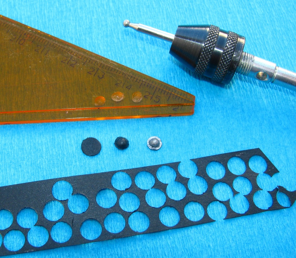 Zwykłym dziurkaczem biurowym wyciąłem krążki z czarnej barwionki. Następnie frezem kulkowym zrobiłem zagłębienie w plastikowej podkładce w którym wytłaczałem krążki nasączone klejem BCG. Po kilkakrotnym wyciskaniu wypukłości i wyrównaniu płaskiego otoka, umbo było gotowe. Potem psiknąłem farbą i przetarłem suchym pędzlem.
