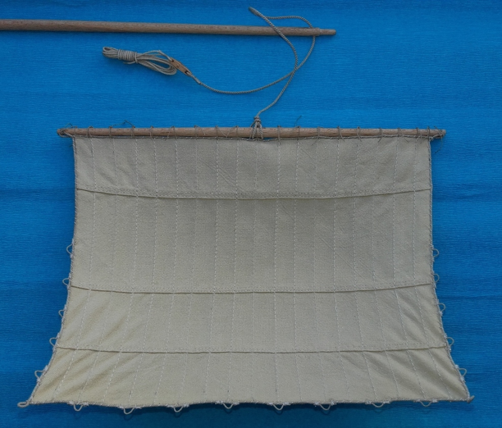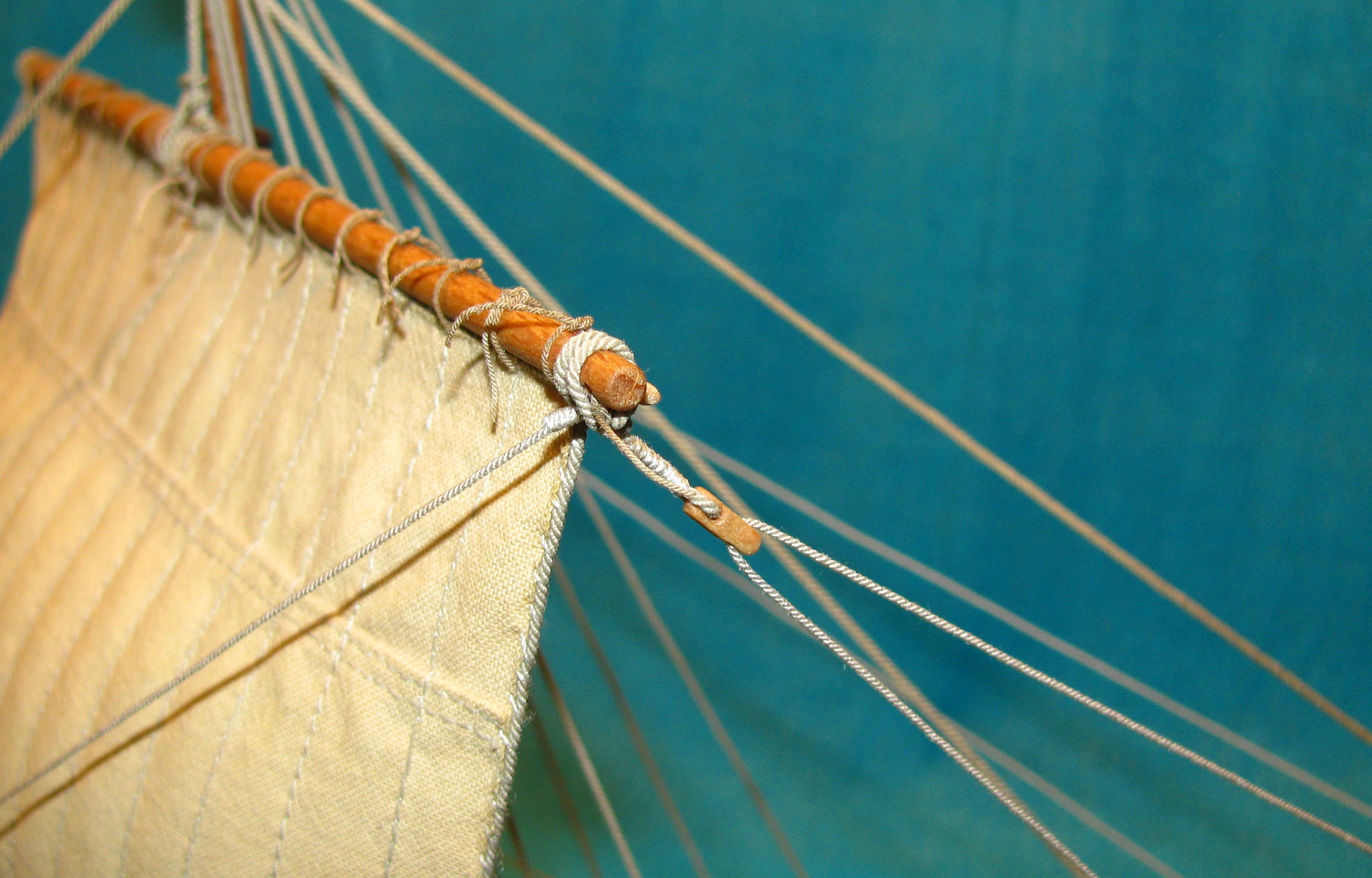 Liklina skręcona z zwykłej nici Ariadna 3*3, kolor numer 0876, uszy (skręcona ariadna 3*2) doszyte bo nie potrafię w tej skali spleść ich z likliną, linki mocujące żagiel do reji również 3*2.