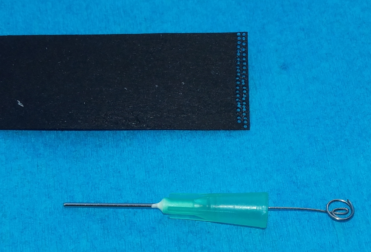 Krążki wycinam obciętą igłą lekarską o zewnętrznej średnicy 0,8 mm co daje mi krążek fi ok 0,6mm.