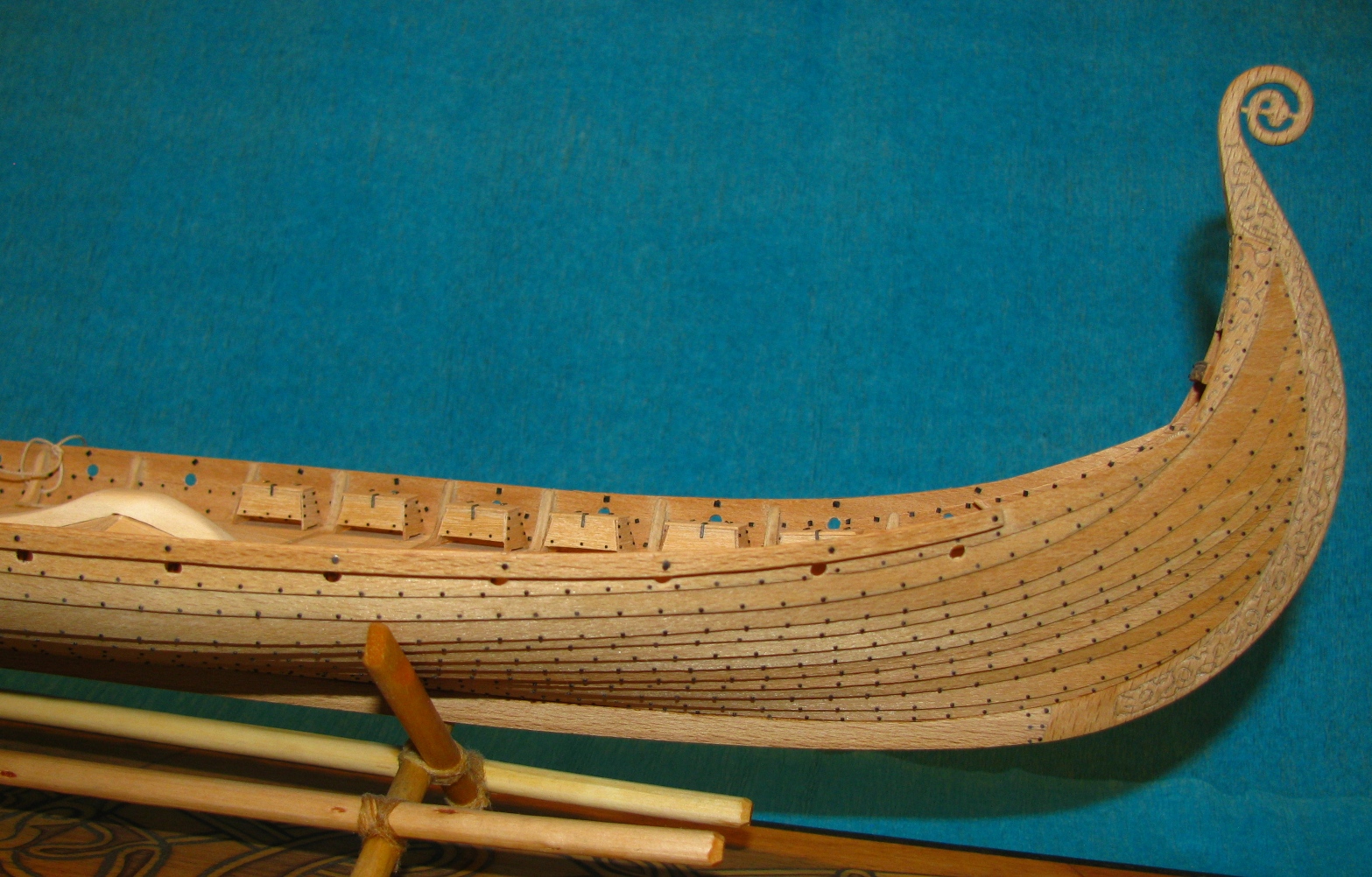 Kształt kadłuba w widoku z boku starałem się wiernie odwzorować, natomiast w przekroju poprzecznym na środku kadłuba nie jest zgodny z kształtem łodzi z Osebergu. Bardziej przypomina przekrój łodzi z Gokstad ale takie były plany z których rozpoczynałem budowę.