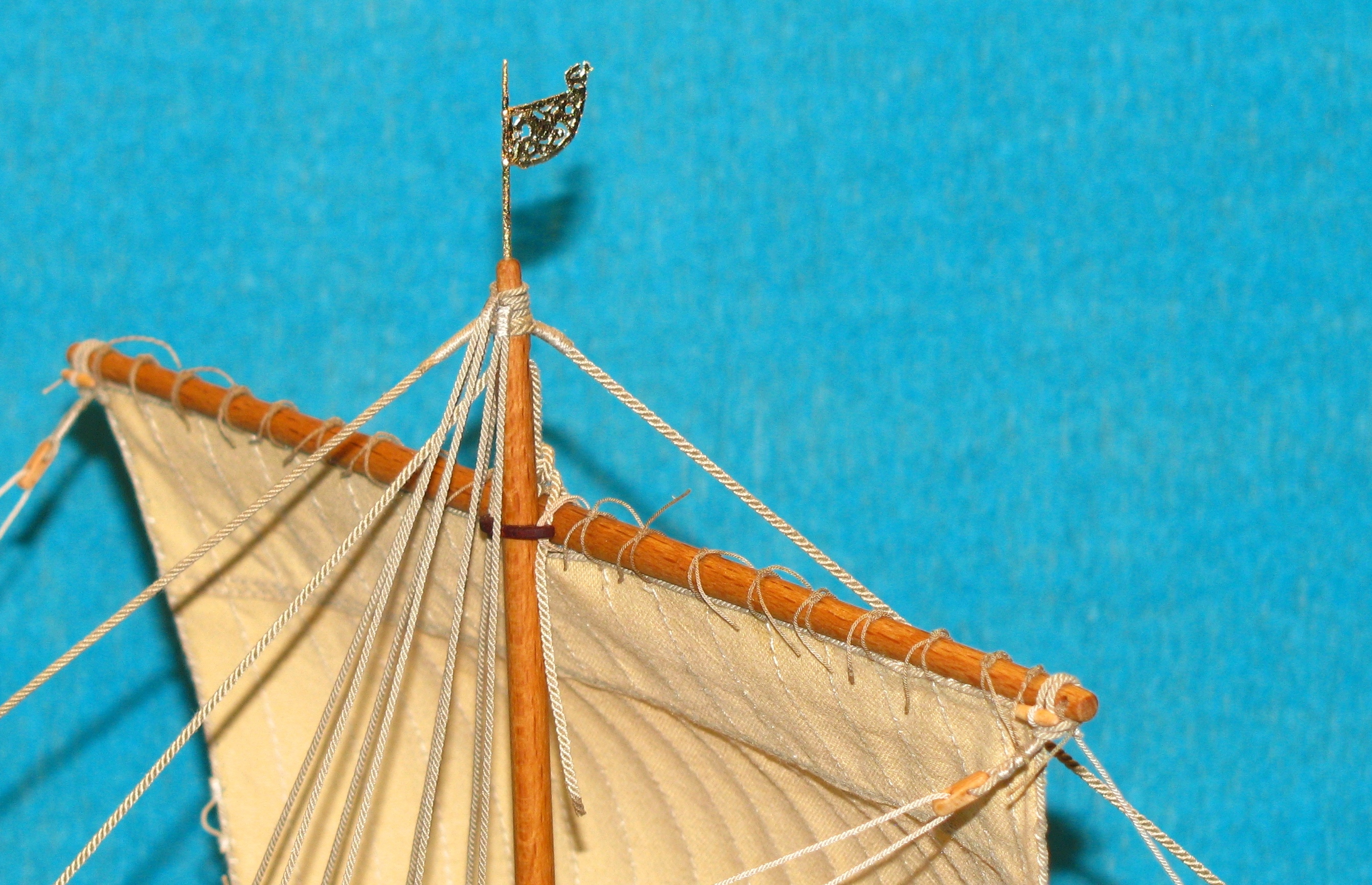 Wiatrowskaz po wycięciu i przyklejeniu do drzewca pokryty został szlagmetalem. Na końcu umieściłem go na szczycie masztu.