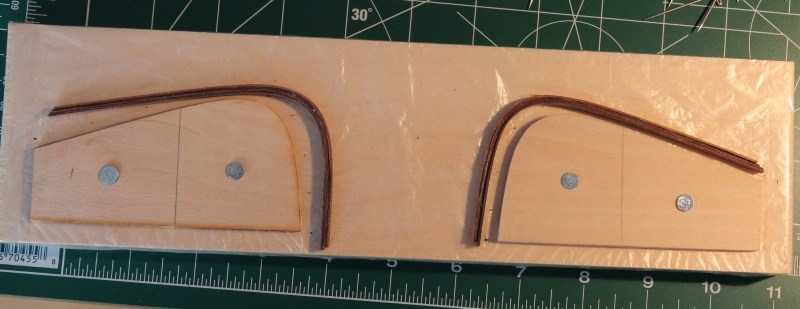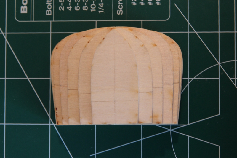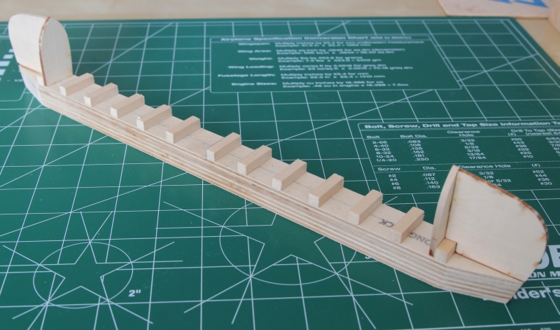 Przyklejone pozostałe grodzie. Dodałem listewki dystansujące od góry, które przyklejam na klej CA. Pomagało mi to złapać pion w osi poprzecznej, i bardziej ustabilizuje grodzie podczas dalszej pracy. potrzebne mi to zwłaszcza, że popełniłem błąd i naciąłem grodzie w miejscu linii poziomej wyznaczającej poziom poszycia. Chciałem aby linie te nie zacierały się, ale osłabiło to deskę i podczas klejenia jedna z grodzi się na tej linii przełamała. Udało się skleić, ale przyda się dodatkowa stabilizacja. Zwłaszcza podczas skosowania.