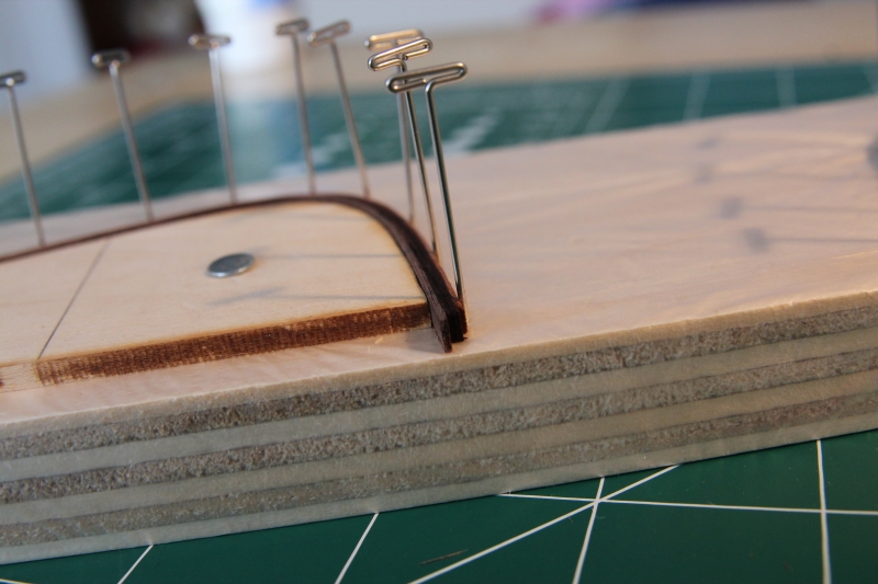 Ostatnim krokiem przed rozpoczęciem poszywania kadłuba jest przygotowanie haczyków podtrzymujących pierwszą plankę w pożądanej pozycji. Przygotowałem je ze szpilek. Jedna starczała na 3 eLki. Nie kleimy planek do grodzi więc tylko tak można ustabilizować pozycję pierwszej planki.