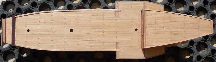 Witam. Tak Piotrze , masz 100% rację - powinno być bez dyskusji jednakowo. Tłumaczenie naiwne ,ale prawda jest taka ,że przejrzałem wiele relacji i widziałem kołkowanie po linii, które , przepraszam Panów – bardziej mi się podoba. Model treningowy. Drugą linię zrobiłem zgodnie z propozycjami, trzecią po linii i zdecydowałem się na drugi wariant. Ten pokład będzie praktycznie niewidoczny, ponieważ nad pokładem rozciąga się zadaszenie. Główny będzie kołkowany jednakowo. Pozdrawiam