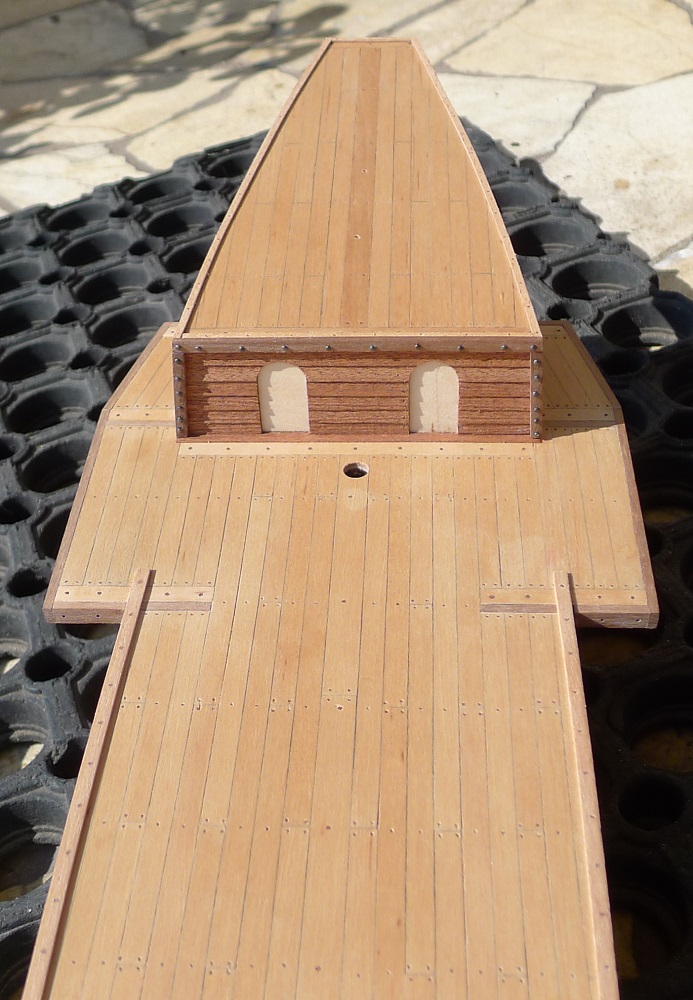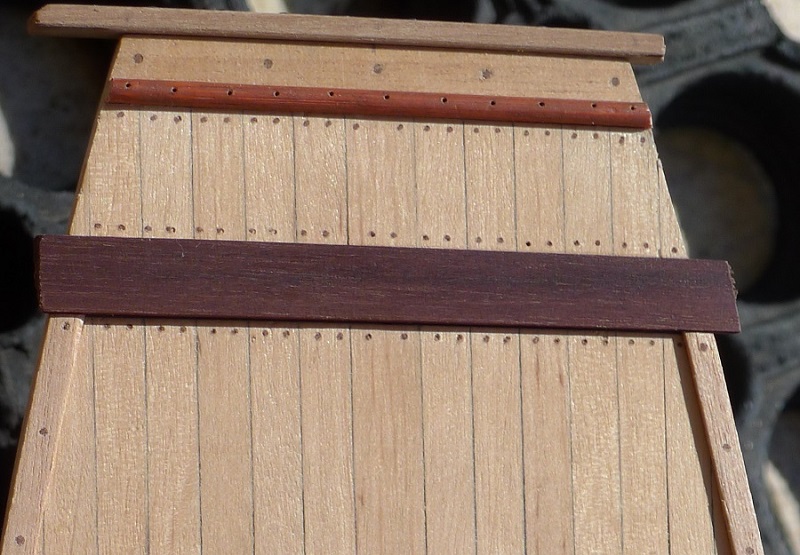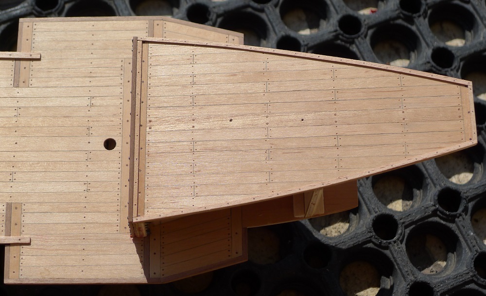 Dziękuję Mirku . Wypróbuję na „boku”. Zapomniałem dodać , że górny pokład był „mazany” Caponem. Przy jego pomocy wcierałem pył w otwory , mający imitować kołkowanie. Piotrze , ta przednia poprzeczna „belka” jest z tych samych listewek orzecha co pozostałe „obwódki” pokładu. Ona właśnie została potraktowana olejem lnianym (wigilijnym ?!-taki znalazłem w królestwie żony) i bardzo fajnie „pociemniała”. Teraz ją potraktuję miksturą Mirka. Tylko pytanie Piotrze, czy po olejowaniu nie masz problemów z doklejaniem wyposażenia pokładu? Czy zdrapujesz , czyścisz miejsce pod przyklejane elementy? A może na „kołki”? A może jedno i drugie?. I jakiego kleju wtedy używasz?