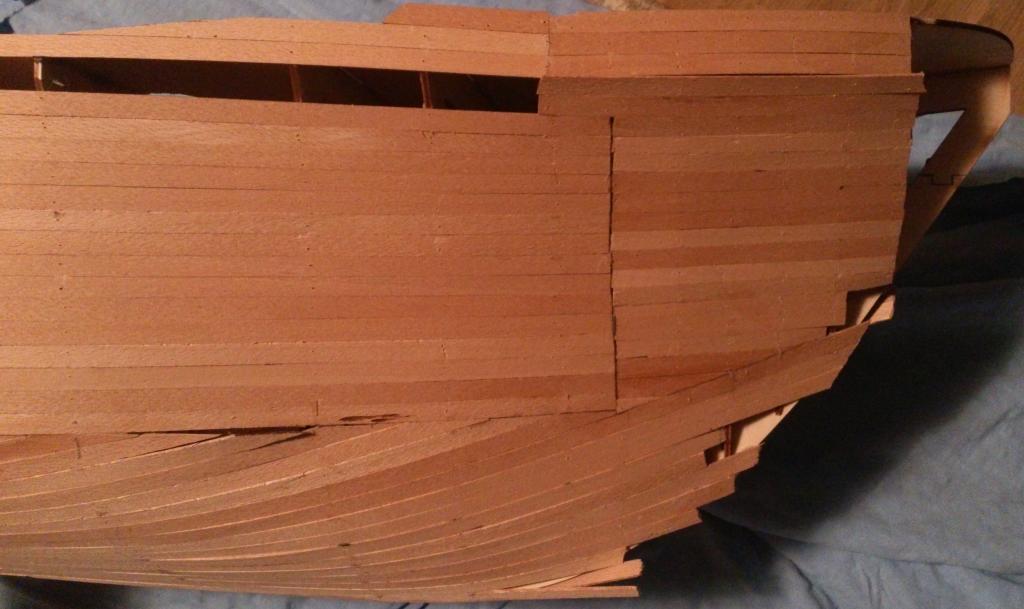 Troszkę wolnego było to i podziałałem. Nie specjalnie się przykładałem bo będę to szlifował i kładł jeszcze jedną 1mm warstwę.Nie przejmujcie się jakością poszycia ale jak pisałem to pierwsza warstwa. Dziś będę uzupełniął dalej. Dziób i rufa ja pełne klocki z twardej balsy ze względu na kształt. Po ostatniej warstwie szlifowanie na gotowo i powlekanie bardzo cienką tkaniną szklaną( chyba 40). od środka tez chyba powlekę. Listewki na poszycie 1,5mm bukowe szerokość około 10mm pocietę samemu z płata bukowego.