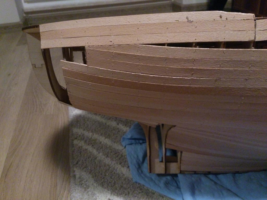Troszkę wolnego było to i podziałałem. Nie specjalnie się przykładałem bo będę to szlifował i kładł jeszcze jedną 1mm warstwę.Nie przejmujcie się jakością poszycia ale jak pisałem to pierwsza warstwa. Dziś będę uzupełniął dalej. Dziób i rufa ja pełne klocki z twardej balsy ze względu na kształt. Po ostatniej warstwie szlifowanie na gotowo i powlekanie bardzo cienką tkaniną szklaną( chyba 40). od środka tez chyba powlekę. Listewki na poszycie 1,5mm bukowe szerokość około 10mm pocietę samemu z płata bukowego.