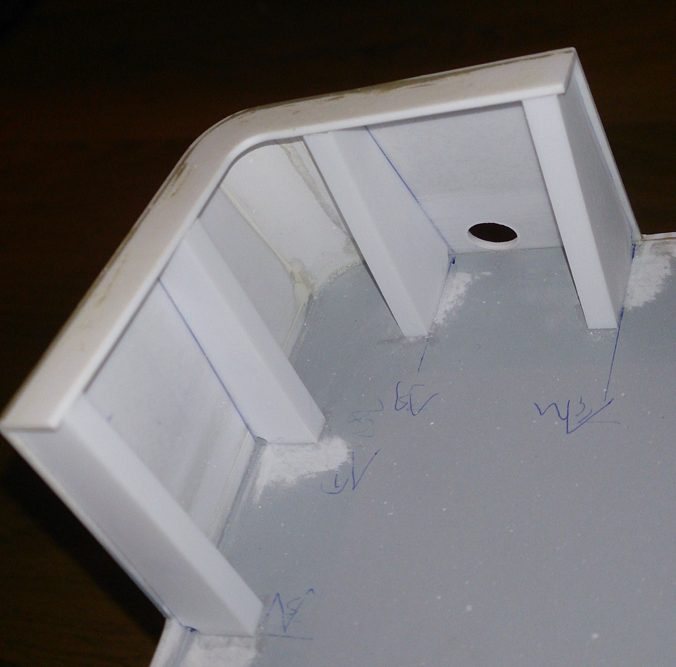 Wkleiłem na gotowo ściankę w sterówkę. Wstępnie zamocowany też dopasowany sufit. Jak będę miał zdjęcia sterówki oryginału to wytnę w odpowienim miejscu otwór na żarówkę pod lampę itp.