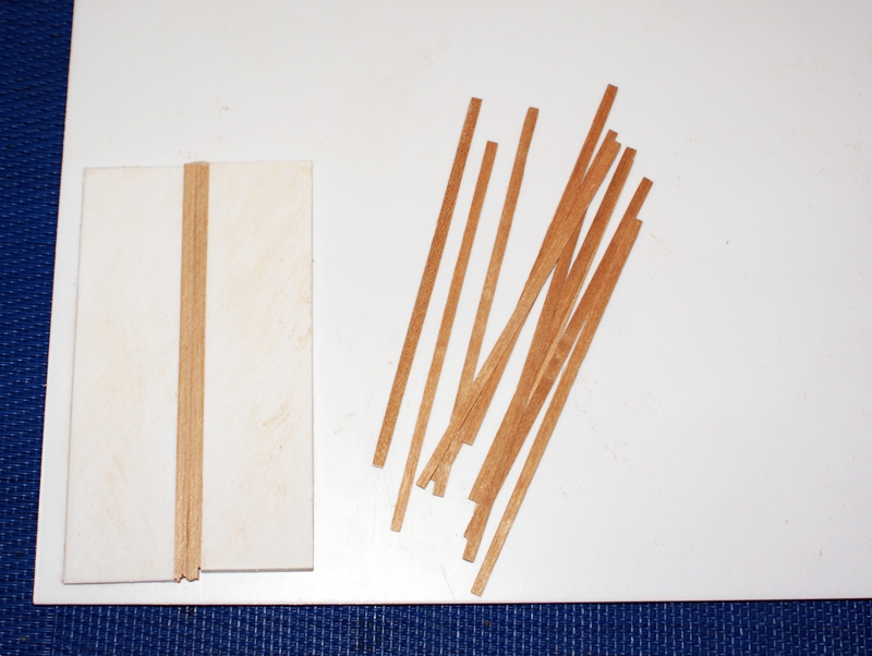 Tak powstają "deseczki" na poszycie pokładu. Między dwoma płytkami o wys. 3mm umieszczam paseczki forniru i szlifuję je do ich powierzchni. Myślę że fotka wszystko wyjaśnia :)