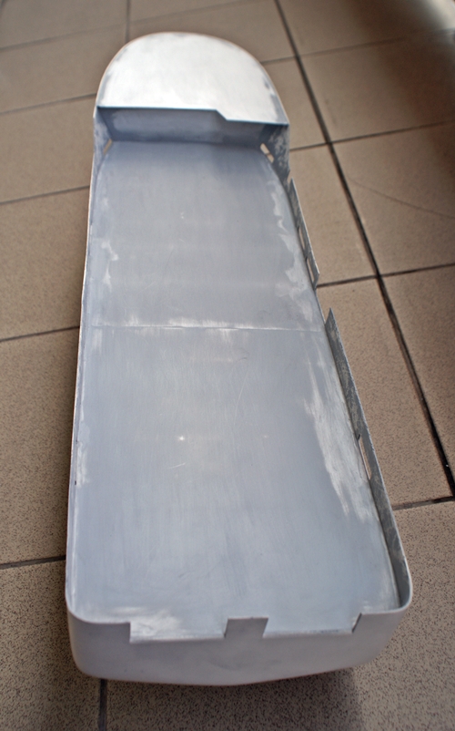 Wymyśliłem sobie że jak pomaluję, to mi niedokładności powychodzą na wierzch. Teraz trzeba to będzie ładnie zeszlifować :) Wewnętrzna część nadburcia była "surowa", tzn widać było strukturę maty i musiała zostać zaszpachlowana. Nie miałem kiedy iść do sklepu i wysłałem żonę. Owszem, kupiła szpachlę Tamiyi, ale szarą i stąd ten kolor nadburci.