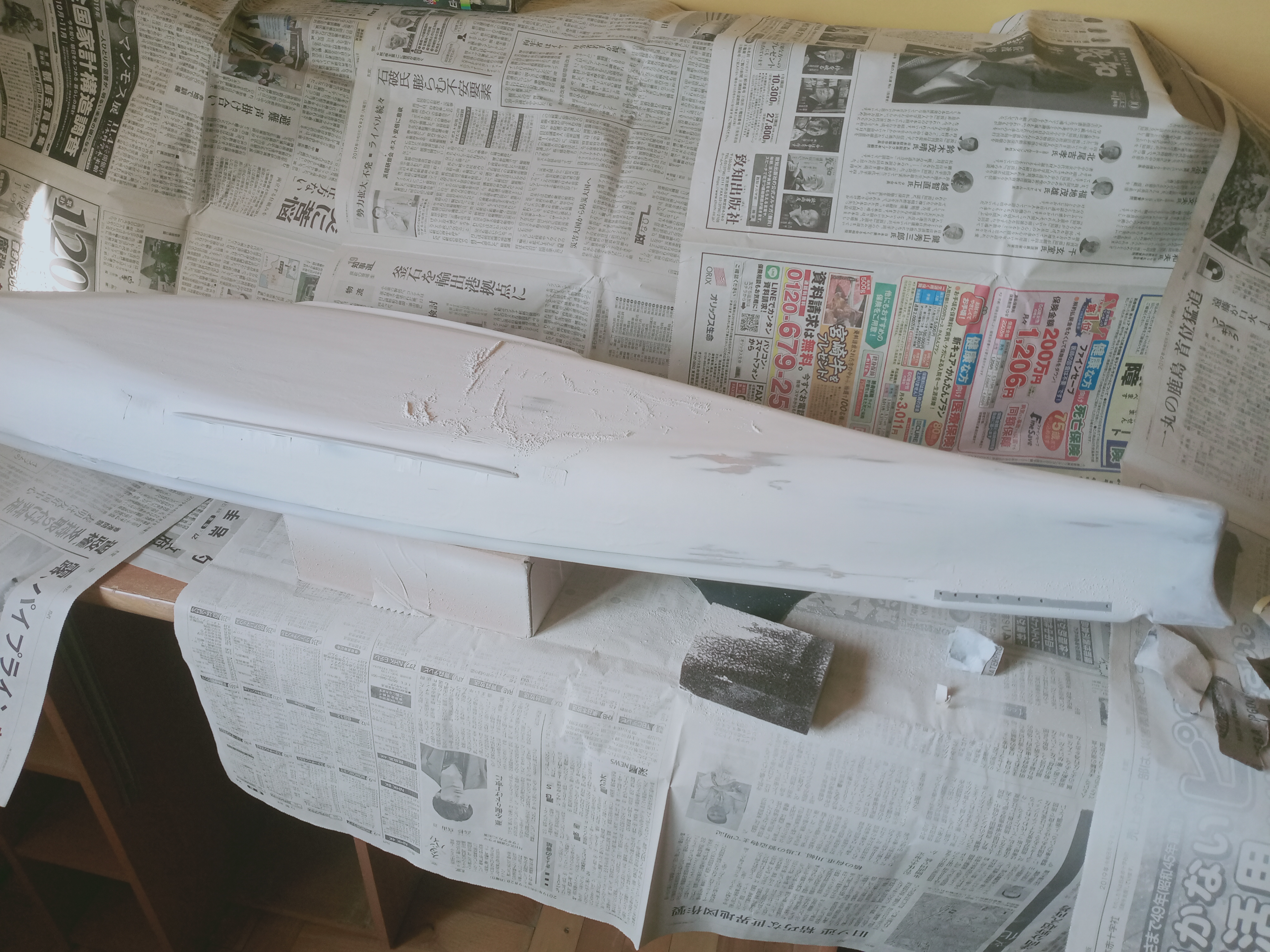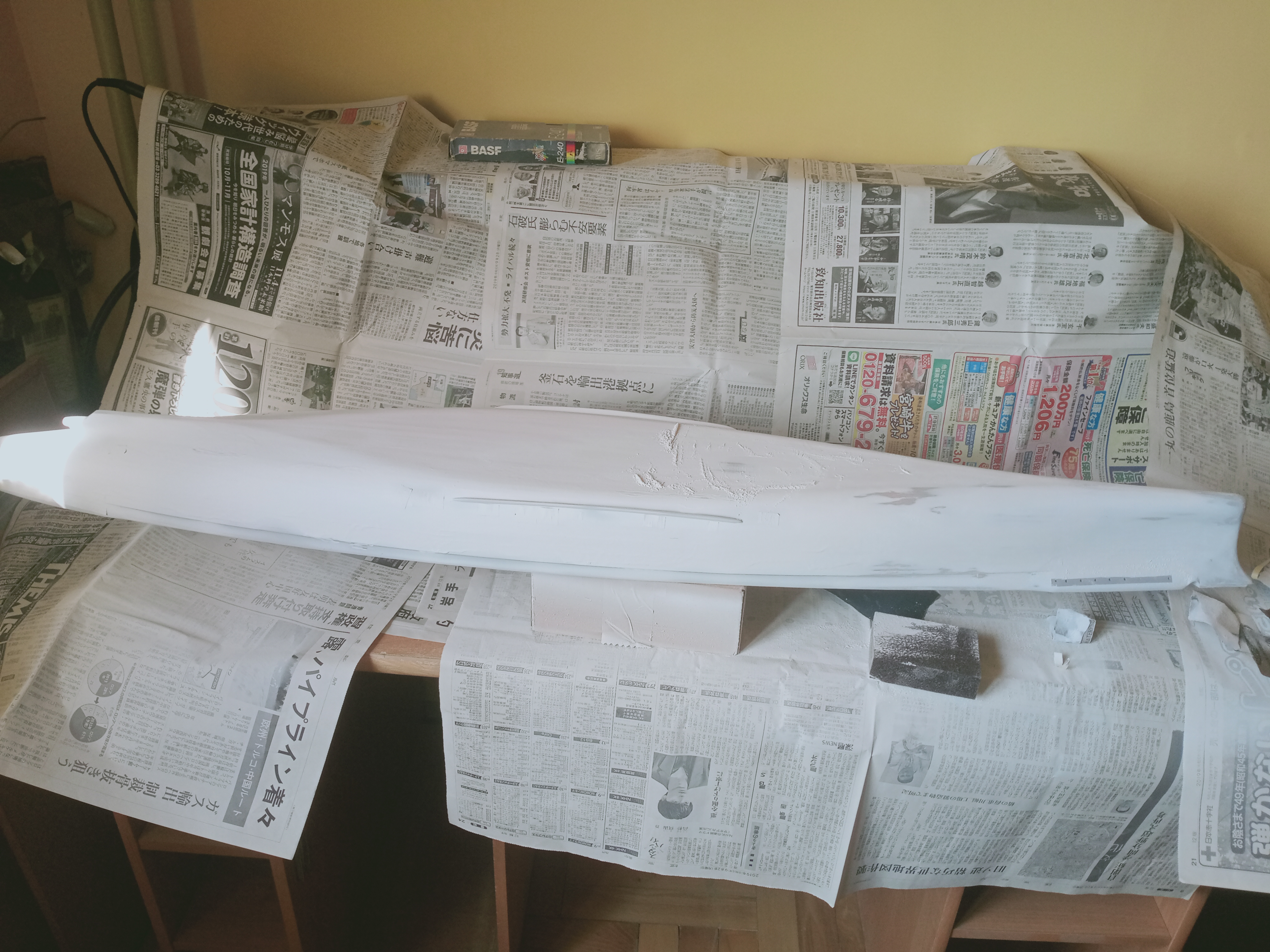 Kadłub zapodkładowany. Jest kilka takich niedoróbek więc muszę jeszcze podszlifować i ze dwa razy jeszcze zapodkładować. Ale z efektu raczej jestem zadowolony. Wszystko jest gładkie i prawie nie widać że poszycie jest z listeweczek.