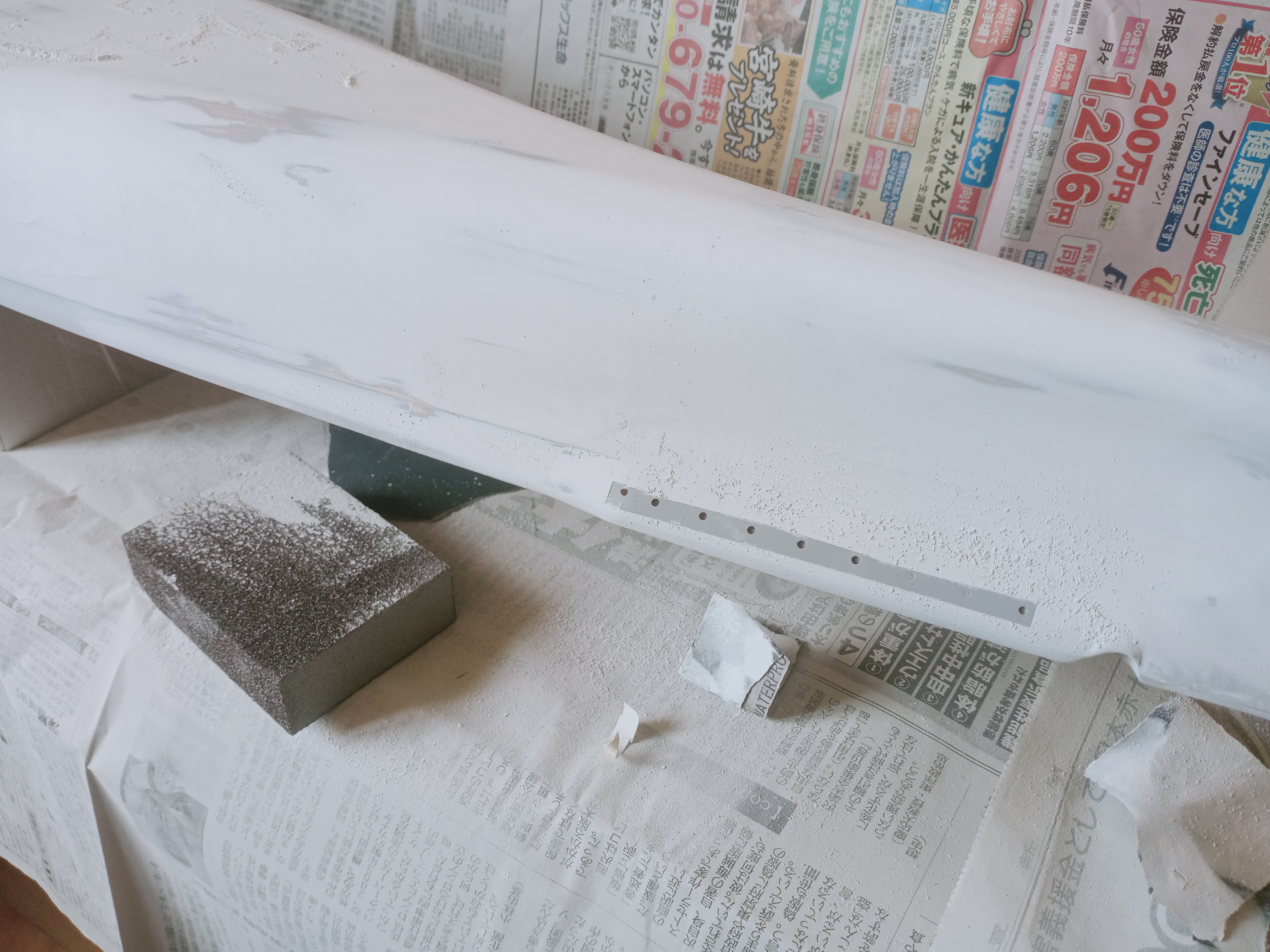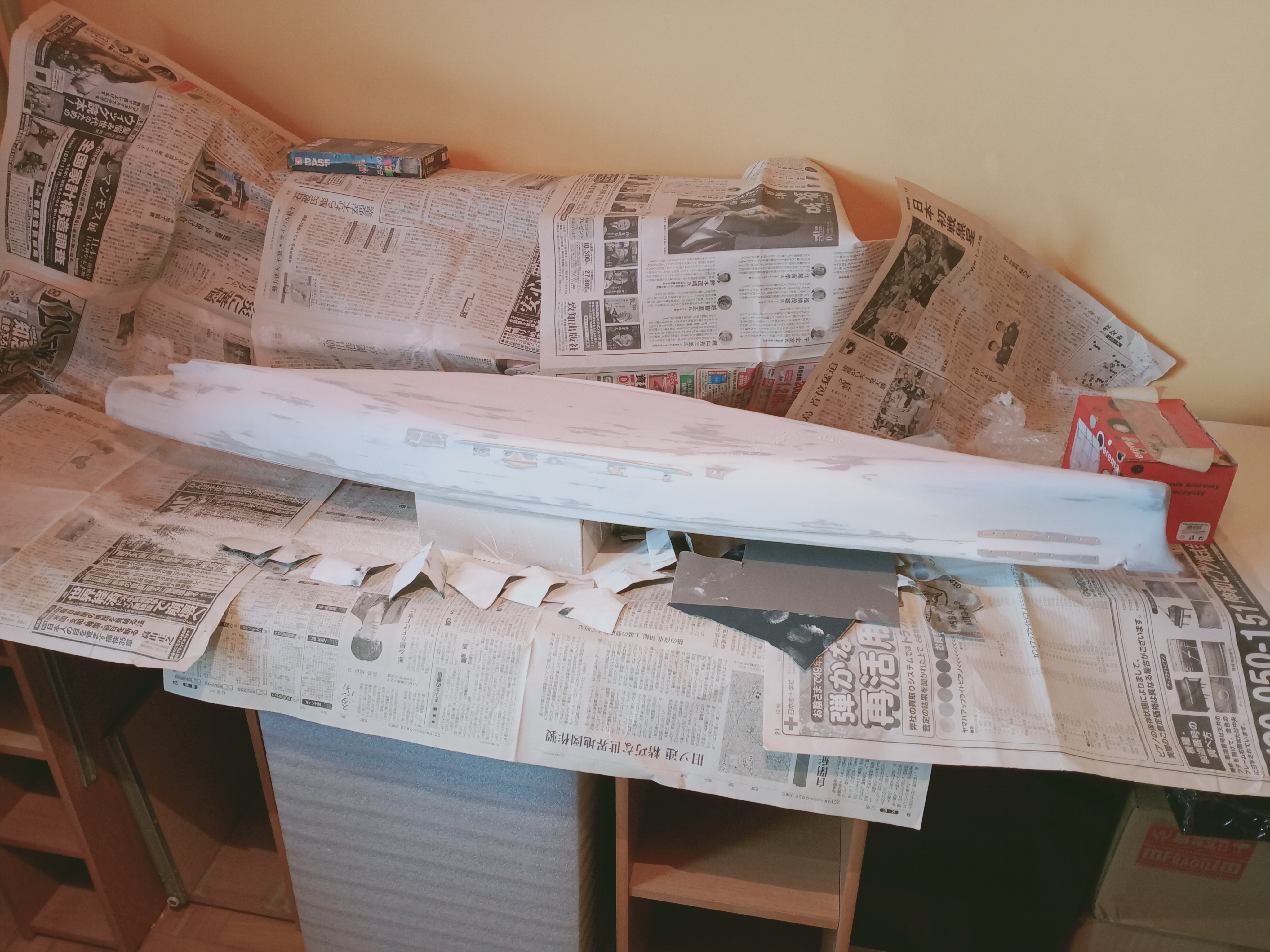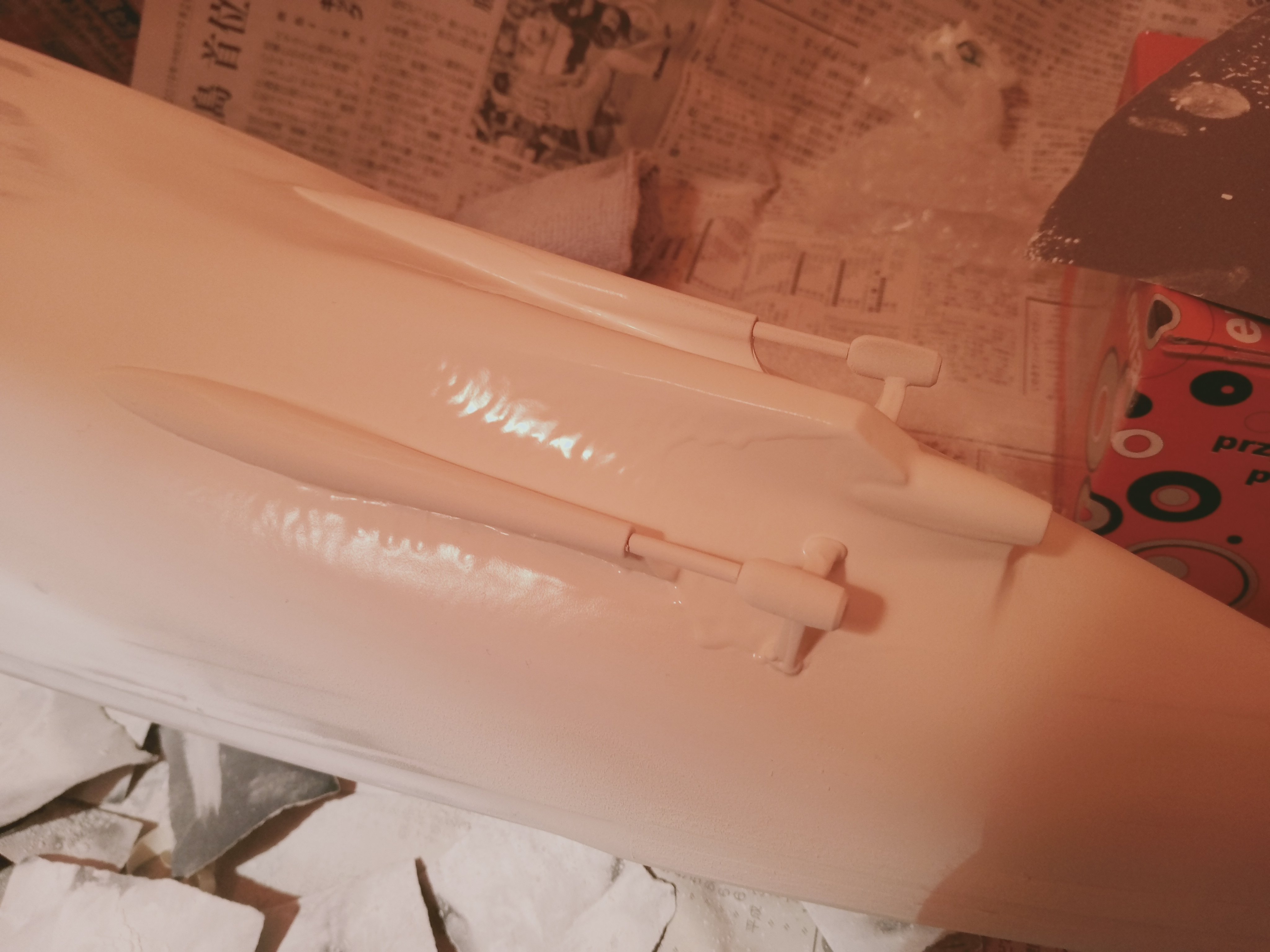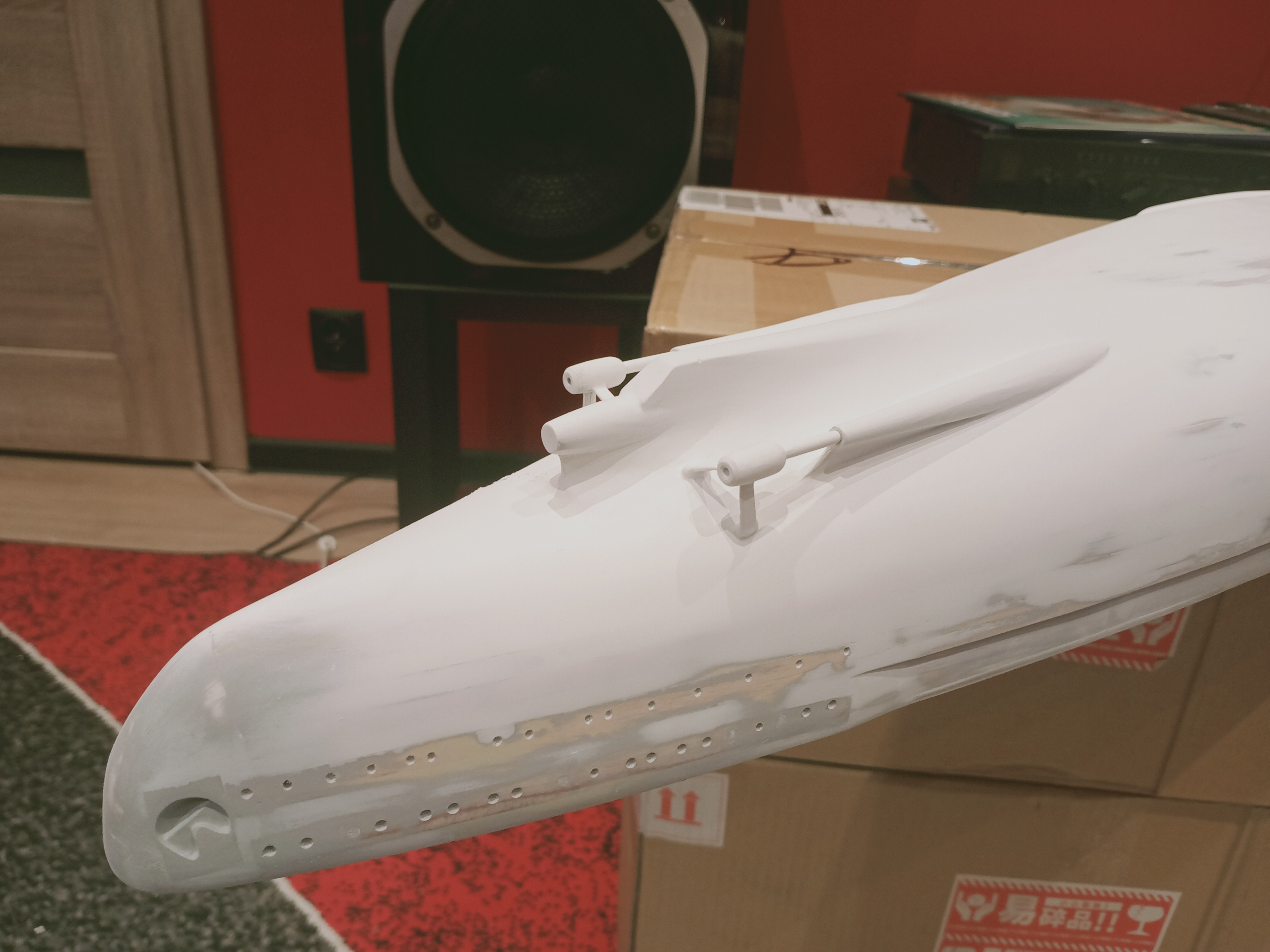 Kadłub szpachlowałem tym razem bardziej zdecydowanie. Używałem szpachlówki w sprayu "Filler". U mnie sprawdzała się po prostu bardzo dobrze. Jedyną wadą jaką zauważyłem to smród. Zasmrodziłem pół pionu w bloku. Nanosiłem warstwy co jakieś 5-10 min, w miejsca które tego wymagały. Na początku był to oczywiście cały kadłub. Obrabiałem go papierem 800. A jak trzeba było w niektórych miejscach bardziej, to zaczynałem wstępnie od gradacji 500.