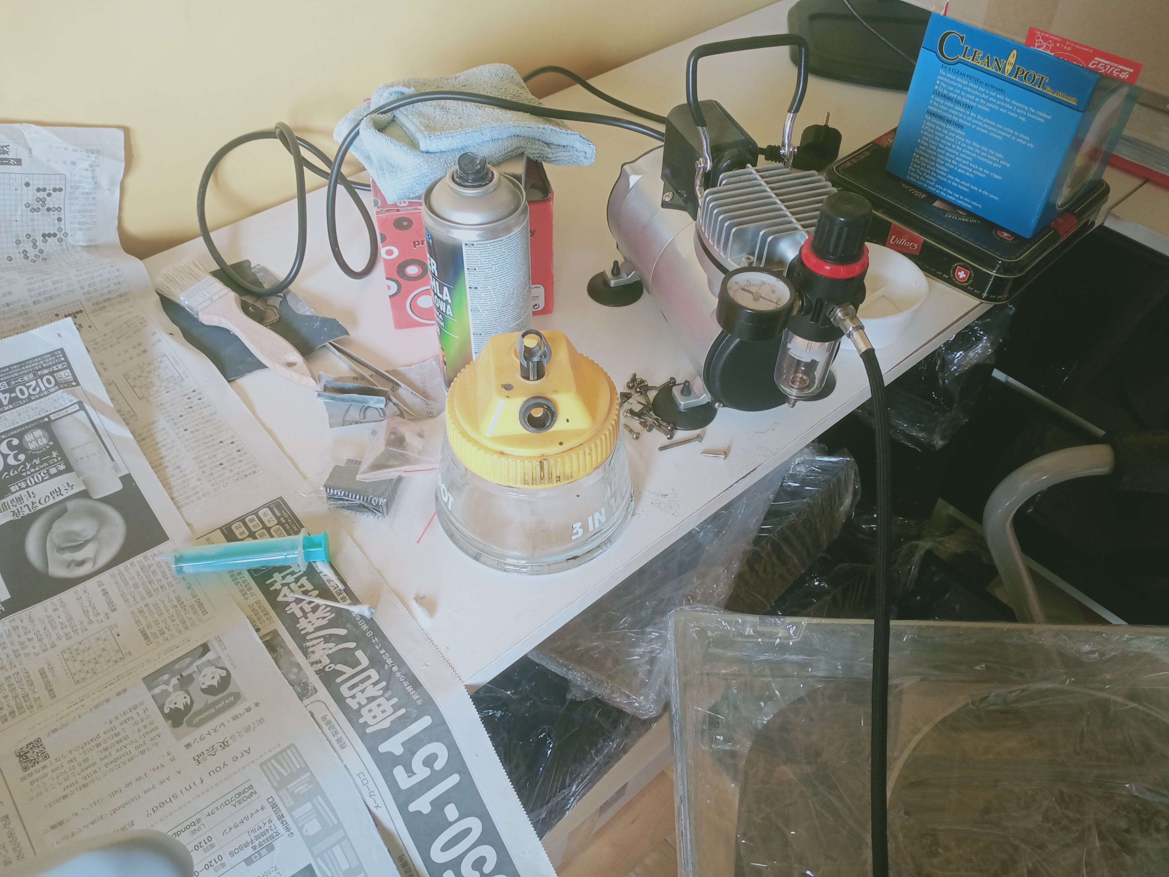 Dzięki koledzy za sugestie. Troszkę nad tym pomyślałem co pisaliście i stwierdziłem że obaj macie sporo racji. Gdy kompresor załączał się żeby dopompować, to pluły resztki farby które odkładały się na dyszy. Generalnie areograf jest ok, ale myślę że do małych powierzchni. Postanowiłem się jednak zaopatrzyć i w nowy areograf i kompresor ze zbiorniczkiem. Kupiłem takie jak na zdjęciach niżej. Ogromnym plusem jest to że mam większe zbiorniczki na farbę i nie muszę co chwila napełniać i to chyba też było przyczyną parowania rozpuszczalnika i odkładania farby przy dyszy.