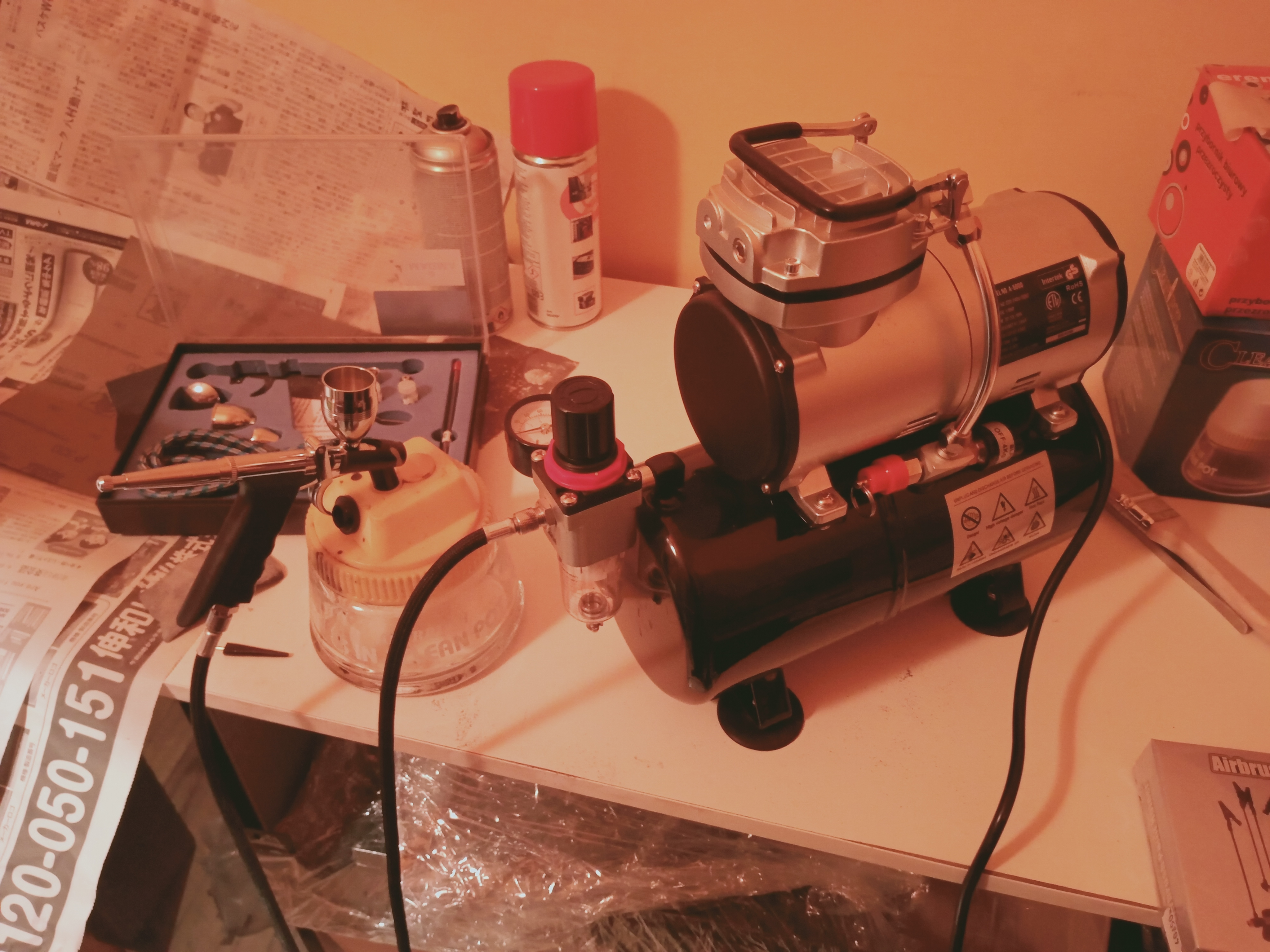 Mam ten sam kompresor i nie mam problemu z pluciem farbą. Moim zdaniem jest to związane raczej z samym aerografem, na jego dyszy może się odkładać farba i co jakiś czas potrafi plunąć. Miałem tak, gdy używałem słabej jakości chińskiego aerografu. Bardzo ważną sprawą jest też gęstość farby. Zdecydowanie lepiej maluje się rzadszą.