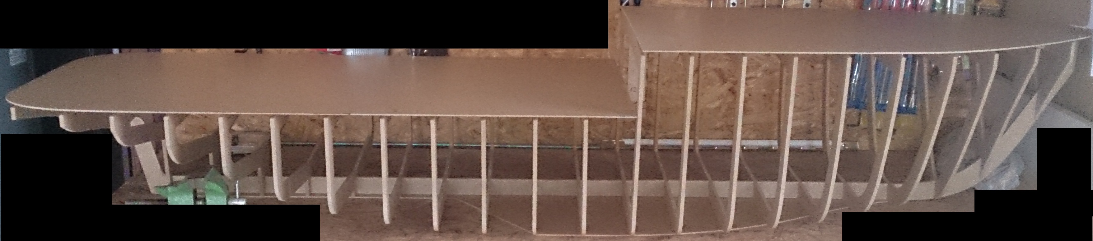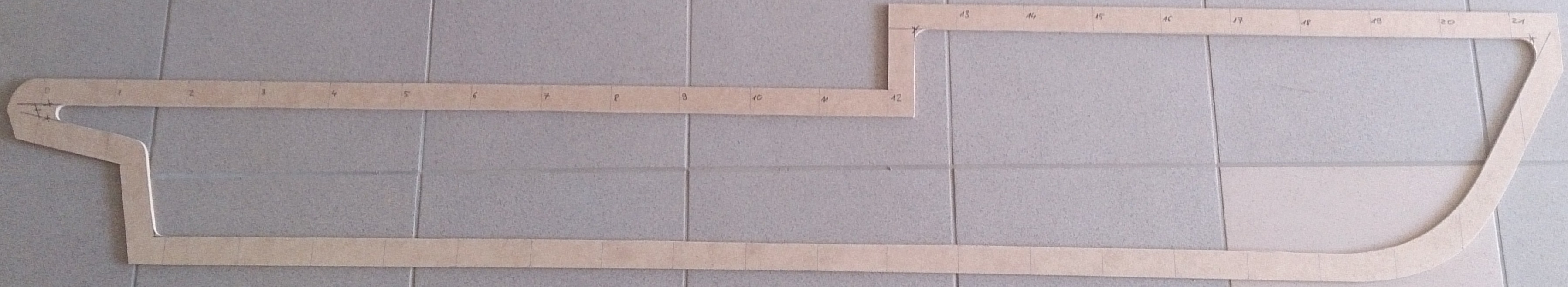 Skala patrz posty wyżej. Szkielet jest dość sztywny nawet teraz bez poszycia. Poszycie listewkowe, szlifowane, na to warstwa szkła, wyszpachlowane i wypolerowane będzie. Wyciąłem bo nie chce mi się dzwigać cięższego klamota a pozatym jeśli mi się jednak nie zechce robić formy i modelu na tym kopycie to zalaminuje od zewnątrz i wewnątrz i będę miał gotowy kadłub. Ale to narazie pomysł. Co do realizacji to za chwilę bo tak czy siak trzeba wykończyć na gotowo to co jest czy to na kopyto czy na kadłub. Czas pokaże jaka będzie realizacja.