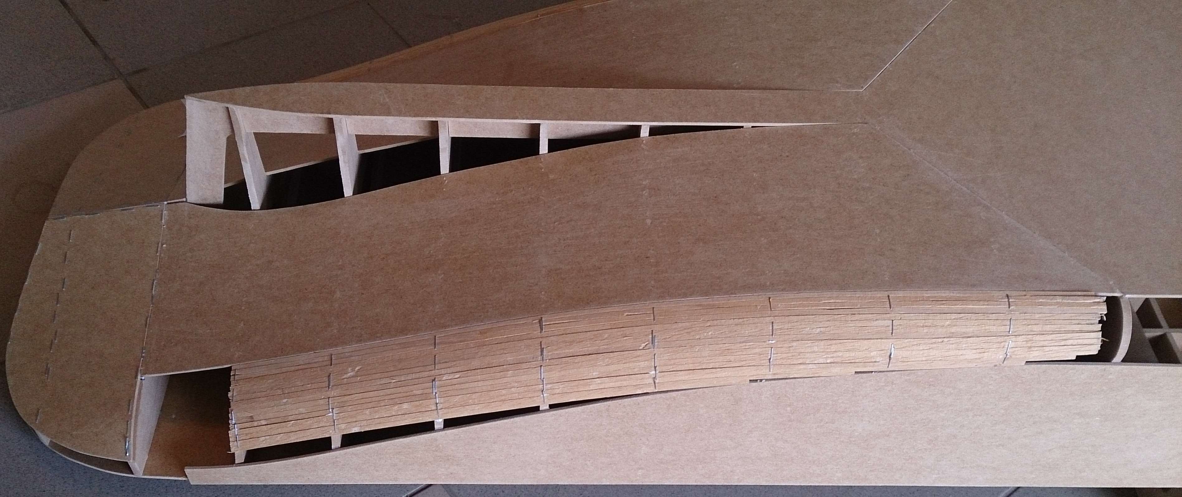 Ładnie masz to wszystko powycinane jak by prosto z CNC, jednak mam pewne obawy co do poszycia, czy przez nałożenie płyty pilśniowej w kawałkach uzyskasz prawidłowe zaokrąglenia kadłuba.