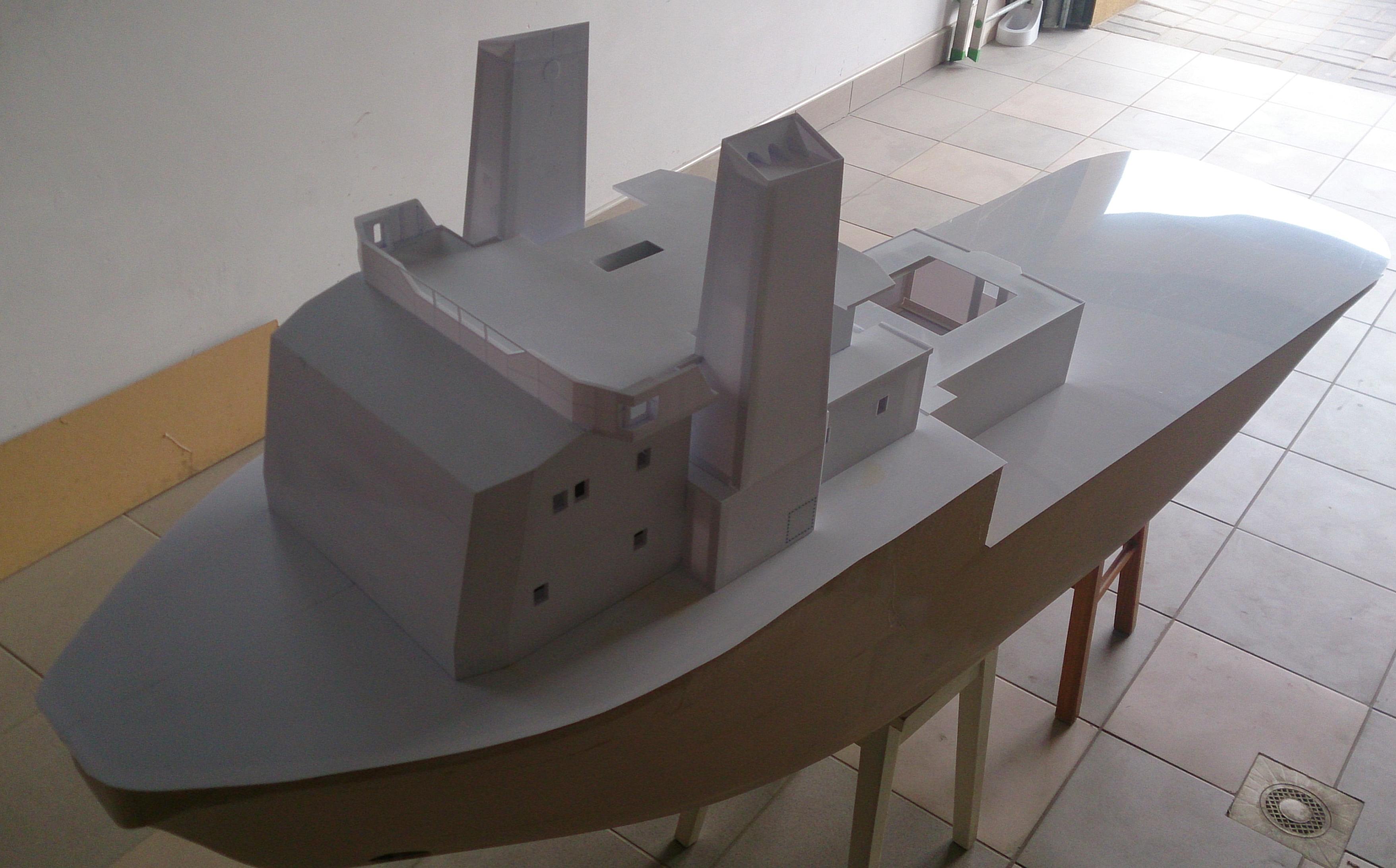 Dosżła pierwsza bryła nadbudówki, maszt główny z podstawą, łoże łodzi roboczej, fundament wciągarki kotwiczno-cumowniczej na dziobie oraz zrzutnie tratw ratunkowych.