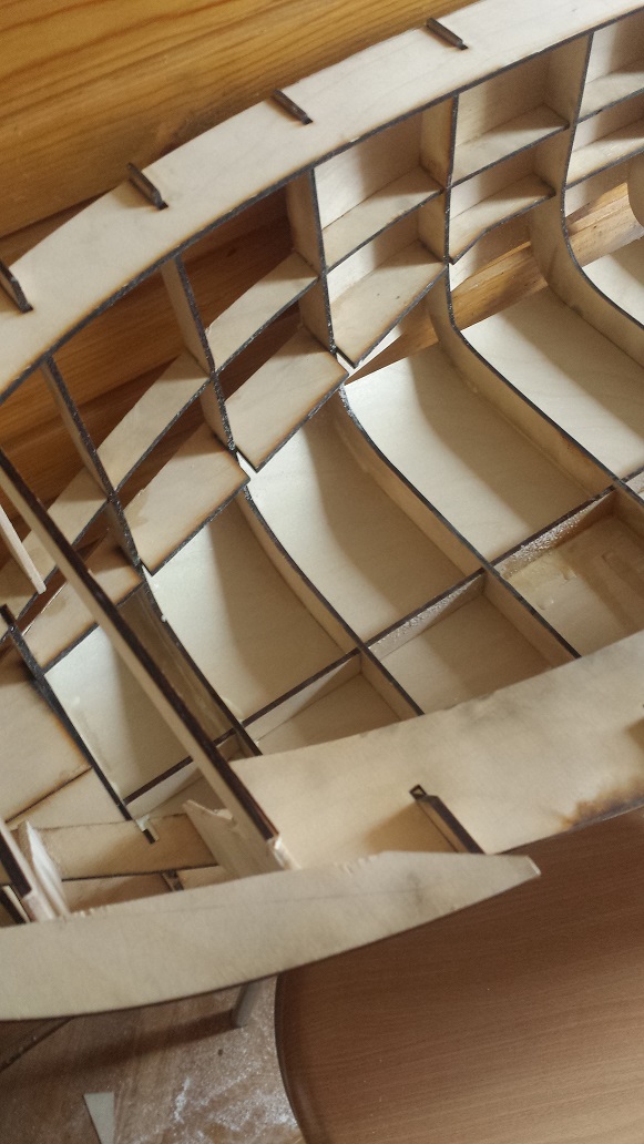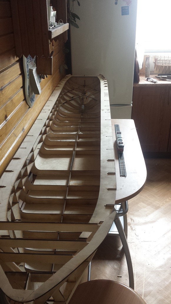 Zapowiada się „kawał” modelu będę kibicował i zaglądał do relacji śledząc postępy, wspomniałem na początku relacji ze Model ma być RC czyli pływający , z racji wybory drewna „sklejki” do budowy kadłuba nie muszę Tobie chyba pisać ze jest to materiał który nie za bardzo naddaje się na kadłuby modeli pływających z racji właściwości drewna do kurczenia się i „puchnięcia” pod wpływem zmiennej wilgotności ale pomijając to jeśli już masz co masz to bezwzględnie połóż tkanine30/50g szklaną i to nie jedna warstwę mate kładź bezpośrednio na kadłub bez wcześniejszego szpachlowania , szpachlować będzie można dopiero po zgrubnym przeszlifowaniu nierówności z żywicy, położenie tkaniny szklanej i tak w 100% nie daje gwarancji ze kadłub z czasem nie spęka tu i ówdzie ale na pewno jest to już jakieś zabezpieczenie, jeszcze jedna uwaga ta spaleniznę po laserze trzeba zeszlifować przed przyklejaniem bo inaczej łącze nie jest pewne .