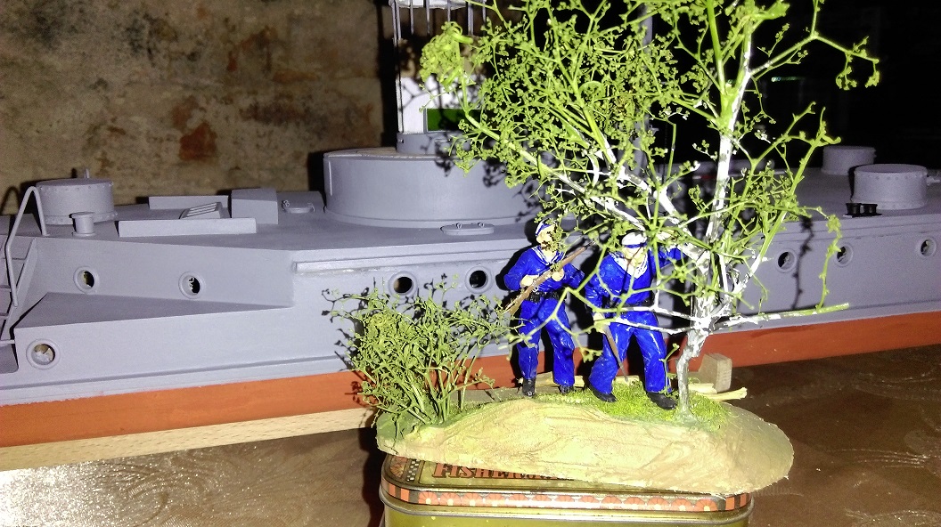 W zasadzie to dziś zrobiłem sterówkę oraz lekko zagruntowałem model przed malowaniem. A z powodu że mój poprzedni model to pociąg pancerny i raczej z marynistyką to tak sobie jestem, to mam pytanie jakie flagi i gdzie się wiesza bo na dziobie jest flagsztok, maszt przedni to pewnie flagi sygnałowe ( ale jakie?), ale co się wiesza pod gaflem tylnego masztu bo na rufie to banderę, nie mogę nigdzie tego znaleźć, mam zdjęcie monitora z Muzeum Wisły w Tczewie ale tam nic na masztach czy na dziobie nie ma zawieszonego