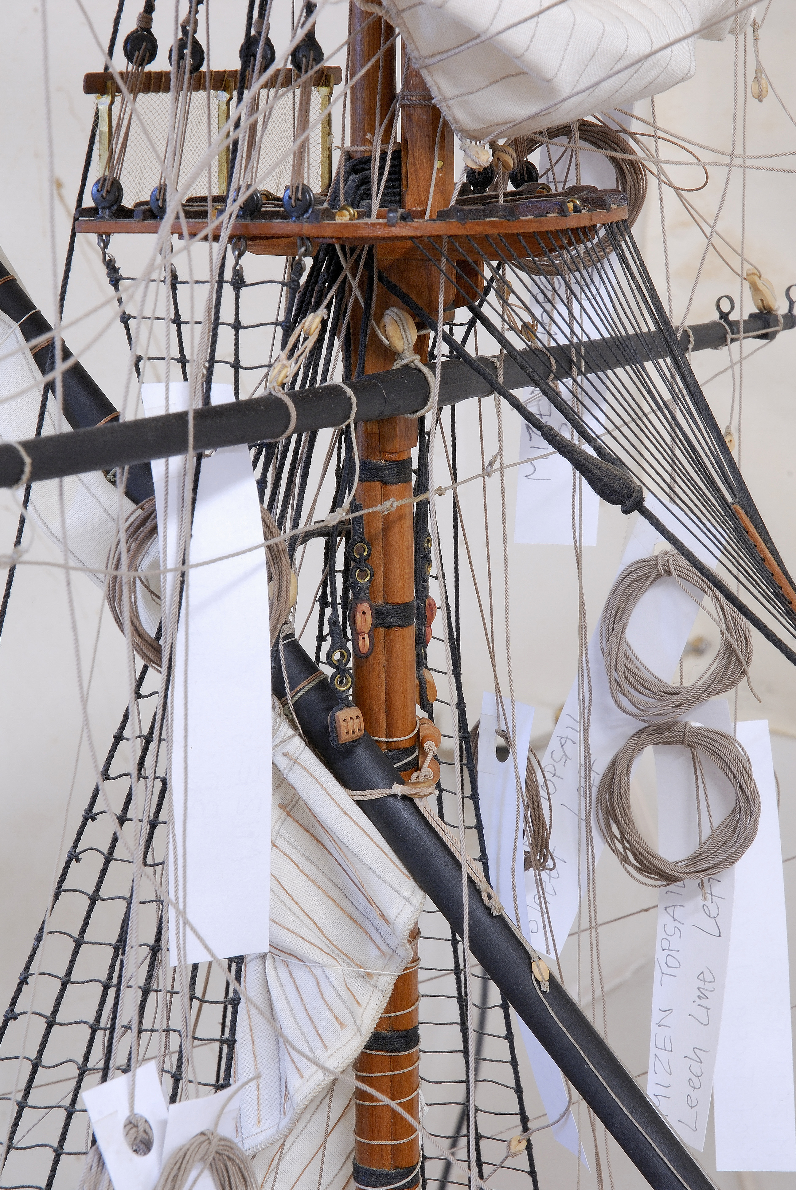 Ostatnio zbudowalem (uszylem) i zawiesilem sredni zagiel na rei od grotmasztu (tzw. main topsail), ze wszystkimi jego akcesoriami, tj. roznego ksztaltu i wielkosci bloczkami i linkami, okuciami dla rei, obszyciem krawedzi zagla linka tzw. bolt rope, tudziez trzema rzedami krotkich linek na zaglu do podciagania sekcji zagla, (tzw. reef lines). Strasznie upierdliwa robotka, ktorej pozniej i tak w wiekszosci nie widac, bo zagiel jest w calosci polowicznie podciagniety na rei do konfiguracji tzw. brailed-up i czesciowo tylko zwiniety wokol rei. Cala ta koronkowa robotka wtedy znika wewnatrz faldow zagla.