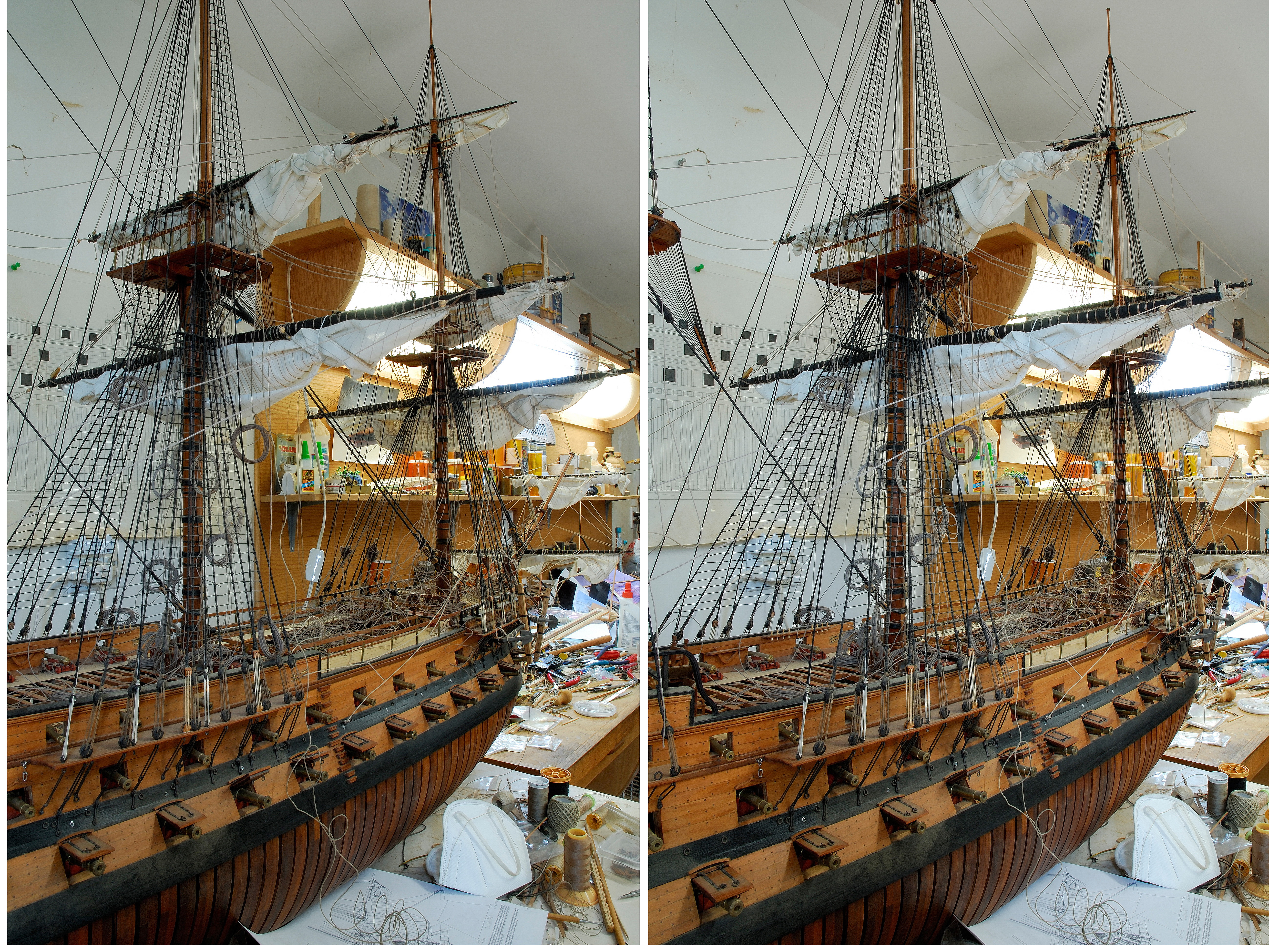 Na oko, pobieznie, oba wygladaja prawie identycznie, ale gdy np. spojrzysz na tylny maszt mizen (czy mizzen) - bezanmaszt, to zauwazysz ze na modelu wg. Boudriota - pierwsze trzy zdjecia z mego poprzedniego postu, - dolna reja (mizen yard) jest dluga i ustawiona w dlugiej osi kadluba, skosnie wzgledem masztu, a do niej jest umocowany trapezoidalny zagiel, tzw. mizen-course (uzywam terminologii anglosaskiej, podanej w angielskojezycznej wersji ksiazek Boudriota). Z kolei na modelu p. Joneta jest rozwiazanie troche nowsze, bo zamiast w/w rei sa dwa drzewce, gaff i boom zamocowane do masztu za pomoca tych widelek (fork) i parrel'u, miedzy ktorymi jest zagiel o nazwie driver. Inne sa tez miejsca (punkty) obwiazania dolnych (running ends) koncow olinowania ruchomego dla rei i zagli.