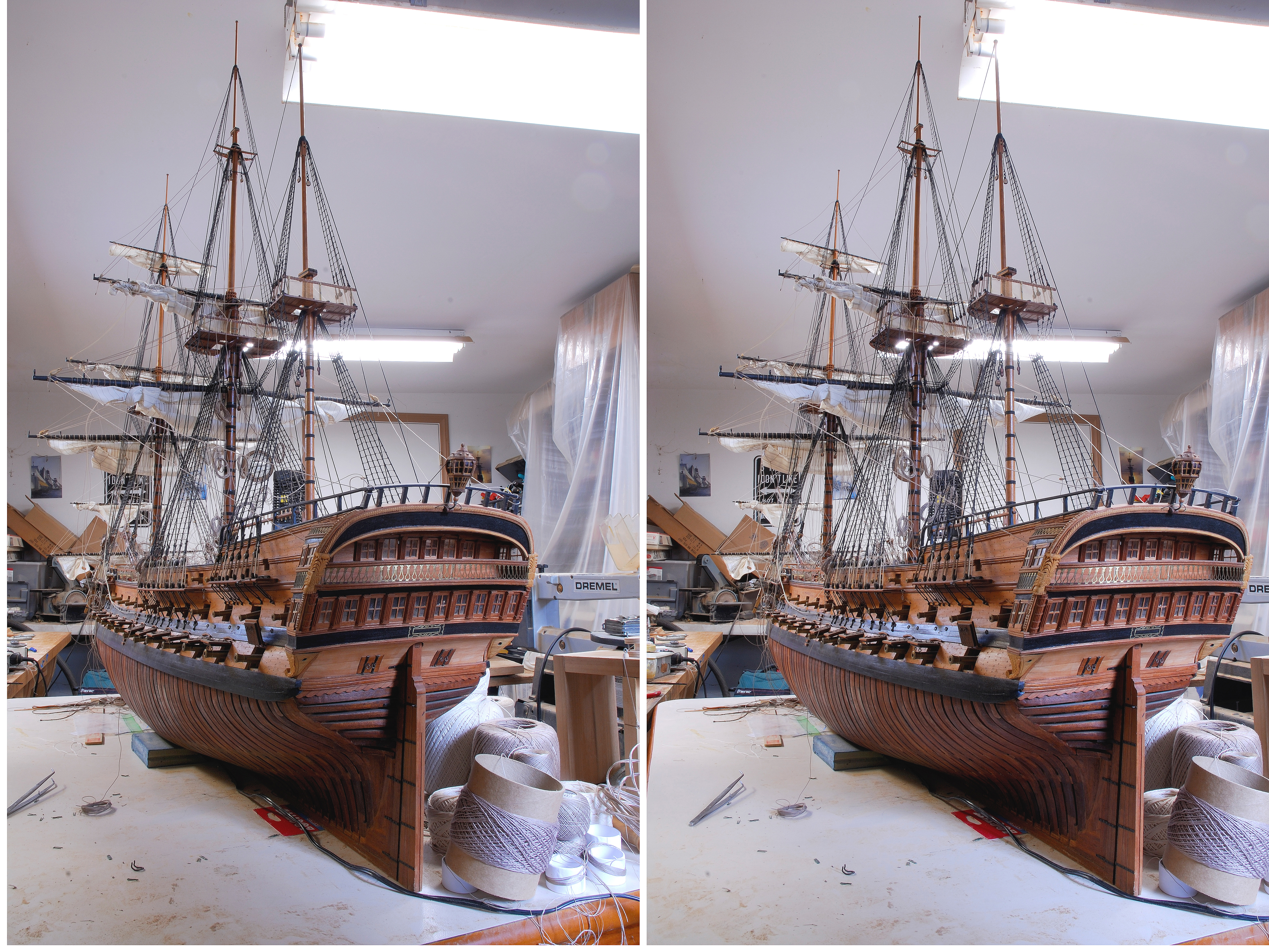 Wracajac jeszcze do wczesniejszego Twego pytania, ja zdecydowalem sie na zobrazowanie mego modelu w konfiguracji tzw. brailed-up, czyli z zaglami tylko czesciowo zrefowanymi, a raczej luzno podciagnietymi na rejach, niz na pokazanie calych plaszczyzn zagli. Dlaczego wlasnie tak? Zwisajace ku dolowi zagle w znacznej mierze zaslaniaja cala ta pajeczyne takielunku, ktora modelarz z wielka pieczolowitoscia stara sie oddac. Czyli - jedno neguje cel drugiego. Wiekszosc modelarzy buduje wiec swe modele z takielunkiem ruchomym ale tylko dla rei, bez zamontowania tam zagli. Wg. mnie to jest podobnie, jakby budowac model jakiegos pojazdu, ale omijajac tam kierownice i kola i ten caly mechanizm sterowania - w sumie to najwazniejsza czesc w pojezdzie! Dlatego ja zdecydowalem sie pojsc na kompromis i uwzglednic zagle, ale czesciowo zwiniete tak, by one nie zaslanialy zanadto tej pajeczyny lin i linek, oraz innych struktur na okrecie.