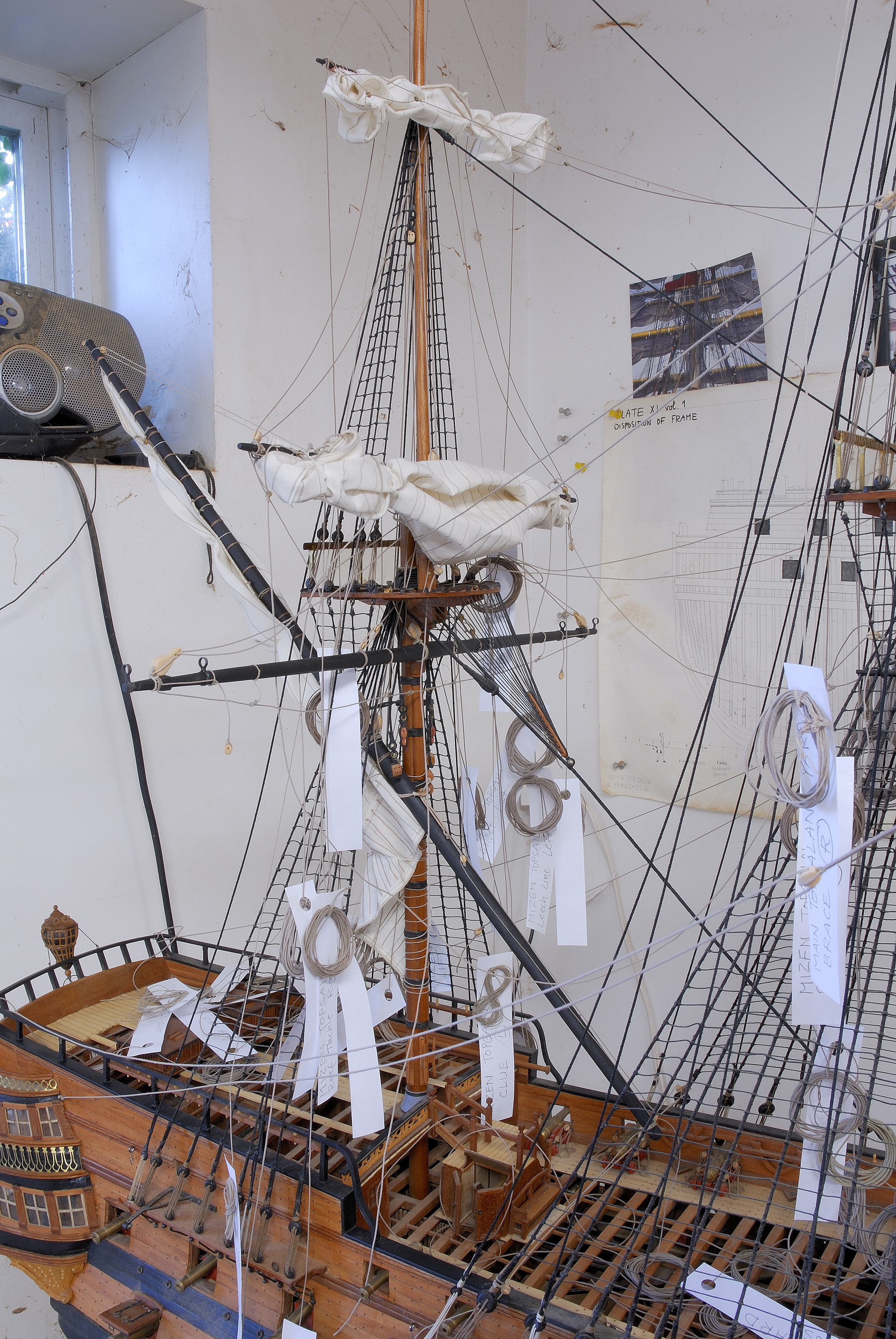 Ostatnio zbudowalem (uszylem) i zawiesilem sredni zagiel na rei od grotmasztu (tzw. main topsail), ze wszystkimi jego akcesoriami, tj. roznego ksztaltu i wielkosci bloczkami i linkami, okuciami dla rei, obszyciem krawedzi zagla linka tzw. bolt rope, tudziez trzema rzedami krotkich linek na zaglu do podciagania sekcji zagla, (tzw. reef lines). Strasznie upierdliwa robotka, ktorej pozniej i tak w wiekszosci nie widac, bo zagiel jest w calosci polowicznie podciagniety na rei do konfiguracji tzw. brailed-up i czesciowo tylko zwiniety wokol rei. Cala ta koronkowa robotka wtedy znika wewnatrz faldow zagla.