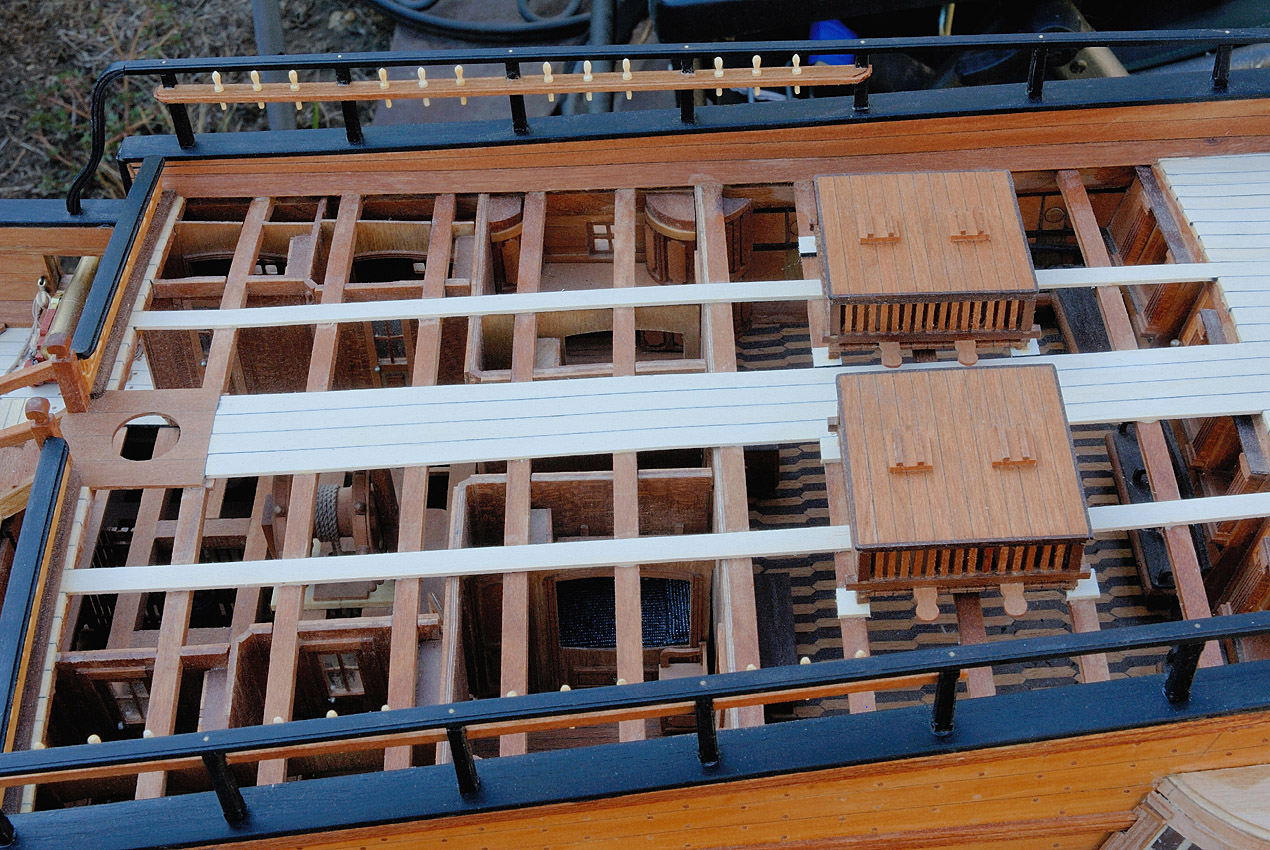 Prace pod pokladem rufowym (poopdeck), wyposażenie kabin oficerskich i kapitańskiej, glowna kajuta rufowa, zabudowa rufy, górny pokład artyleryjski, klatka schodowa z pokładu dolnego na górny i ćwierćpokład, początki modelowania dziobu (tzw. upper cheeks - dosłownie gorne "policzki" (?) )