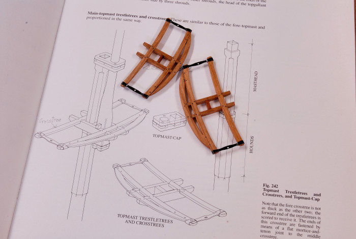 Powolutku ide w gore. Wytoczylem gorne maszty (topmasts) i sklecilem tzw. trestletrees i crosstrees (nie wiem, jak to Wy nazywacie po polsku. Saling?). Plus dalsza odrobinka olinowania stalego (trzeba mi przyciac te "wasy" od wyblinek).