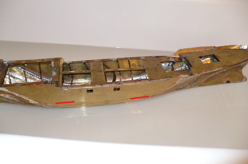 Nie mogłem się powstrzymać i tak na prędko polutowałem aby zobaczyć jakie zanurzenie . Co prawda jeszcze przecieki i długa droga to wygłaskania ale pływa i nie spodziewałem że takie jest małe zanurzenie . Ma przechył na lewą burtę ale po wyrównaniu ma takie zanurzenie jak widać zaznaczyłem kreska czerwoną . Przyznam sie że spełni się moje marzenie ale długa droga . Najważniejsze zrobione . Teraz powyciągam wręgi z całego środka , zostawię te na rufie i dziobie czyli cały środkowy pokład .