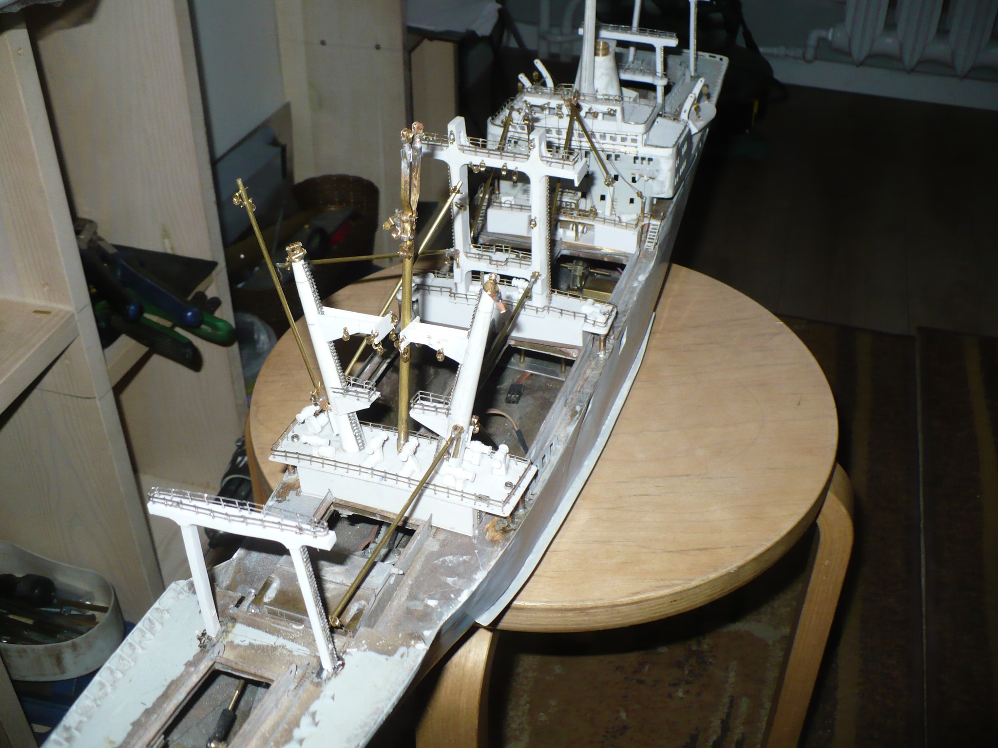 Pozostałe elementy to pręty koła zębate itp. wykonane z mosiądzu . Model posiada ster strumieniowy otwierane pokrywy ładowni ruchomy mechanizm podnoszenia kotwic. Nadbudówki wykonane są z pleksi, bomy i drabinki to rurki mosiężne i pręty .Model wykonany ręcznie .