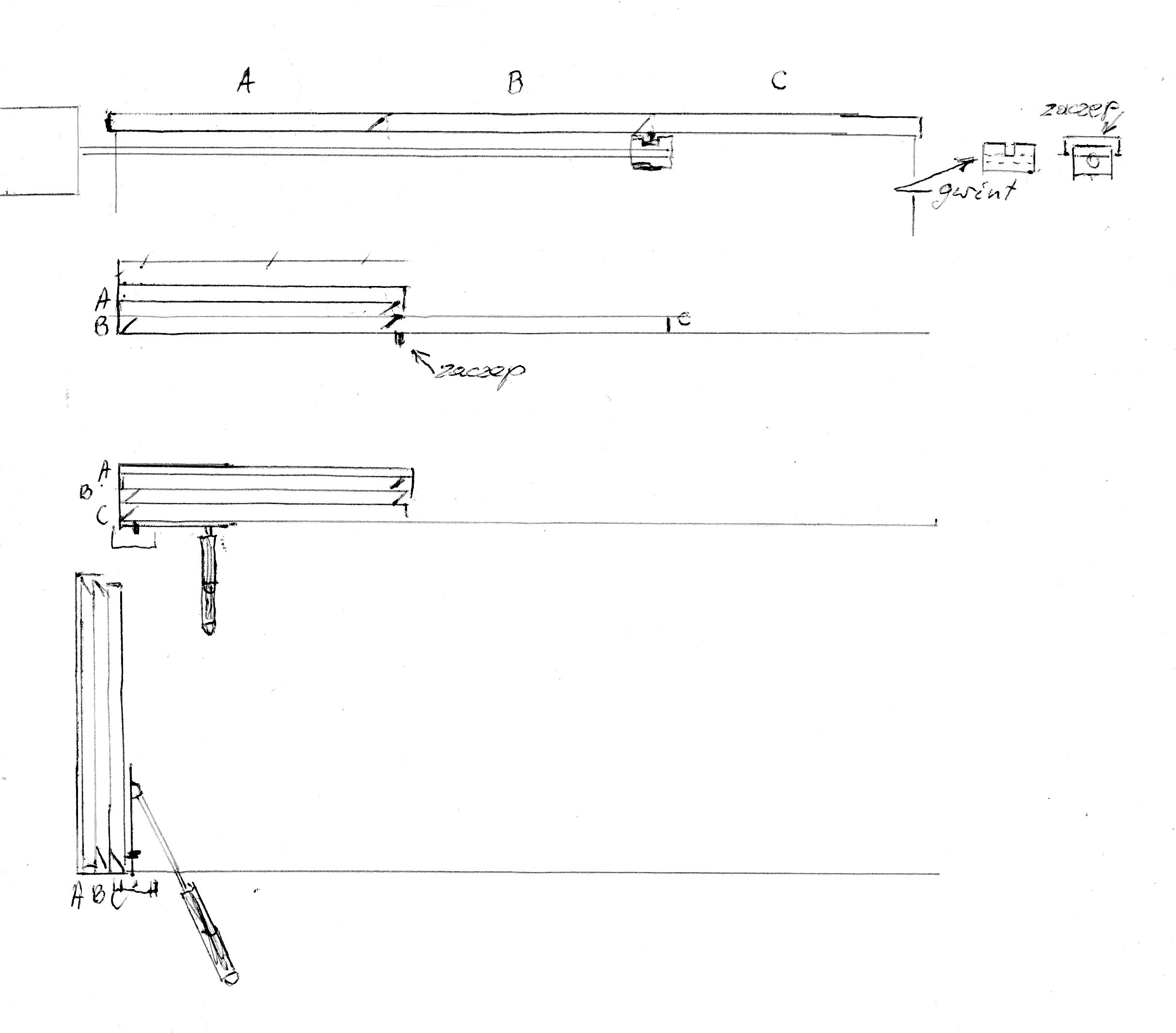 Kostka na gwincie zaczepem przesuwa pokrywę C i B wsuwając skosem pod A oraz dalej C pod B i A. Na końcu uruchamia siłownik, który stawia pokrywy w pozycji pionowej. To by pasowało do planu. Gorzej z zamykaniem. Kostka przesuwa się w prawo i żeby nie zabierać wszystkich pokryw dochodzi blokada z pręta widoczna nad pokrywami, której nie ma na planie. Wysuwa się C, spada B A i dalej jakimś zaczepem C ciągnie B, spada A.