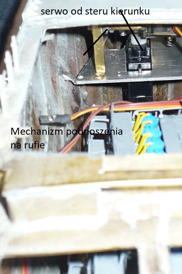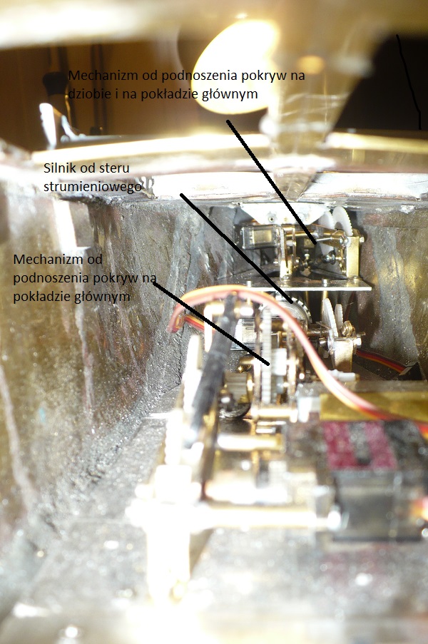 Muszę do dalszych prac znać wyporność . W tym celu umieszczam podzespoły . Umieszczam je tak że za każdym razem sprawdzam przechył. Teraz mam umieszczone podzespoły silnik napędowy wraz z wałem i śrubą . Na dziobie , międzypokład ,blacha aluminiowa 2 mm a na niej 2 mechanizmy otwierające przednie pokrywy wraz z mechanizmem podnoszącym . Pod tym pokładem znajduje się silnik napędowy od steru strumieniowego . Na tym samym pokładzie znajduje się silnik z przekładnią od podnoszenia kotwic oraz mechanizmy podnoszące pokrywy.Teraz musza dodać między pokład na rufie aby tam umieścić serwo od steru oraz mechanizm podnoszenia pokryw .Na końcu dodam całą elektronikę .