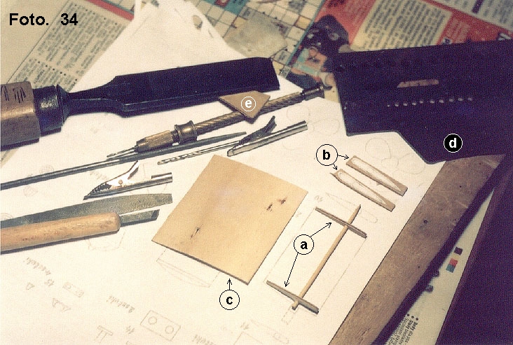 Po wydrukowaniu czy odrysowaniu czterech przekrojów poprzecznych tych sterów [ja odrysowywałem przy użyciu kalki ołówkowej i wykałaczki]. Przy odrysowywaniu poprzez kalkę uzyskałem cztery identyczne rysunki. Nie użyłem do kalkowania ołówka tylko patyczka wykałaczki, aby rysunek był wyraźny a plany nie uszkodzone. Dwie kartki papieru zgięte na połowę zostały w grzbiecie sklejone [można to zrobić w zeszycie], aby się nie przesuwały względem siebie i tak pozostaną aż do momentu wycięcia przekrojów. Zanim je wytnę wyznaczam środek osi i w tym miejscu nakłuwam igłą po przez wszystkie przekroje. Następną czynnością jest narysowanie twardym ołówkiem H3 pomniejszonego [o grubość użytego forniru] obrysu również poprzez kalkę. Teraz można przekroje wyciąć pojedynczo a nie razem [unikamy przesunięć]. Te przekroje ja nakleiłem na kształtkę modelarską [sklejka] gr. 1,5mm - wskazanie [e] i [b] na foto. 34.
