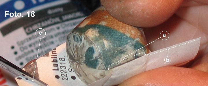 To jest proste. Wysokość paska papieru musi równać się długości boku, [b]+[/b], co najmniej dwie długości promienia lub jak kto woli całej średnicy większej podstawy stożka - wskazanie b i c. Lepiej jednak ten wymiar jeszcze trochę zwiększyć [doświadczalnie]. Od staranności obklejenia kopytka pierwszym paskiem papieru zależeć będzie, jakich dokonam jego uszkodzeń podczas zdejmowania skorupy z kopytka. Więc punkty klejenia muszą być jak najmniejsze, a klej gęściejszy, aby nie przesiąkał przez papier. Najpierw górny naddatek, później dolny naciąłem nożyczkami tworząc wąskie paseczki jak wskazuje foto. 19.