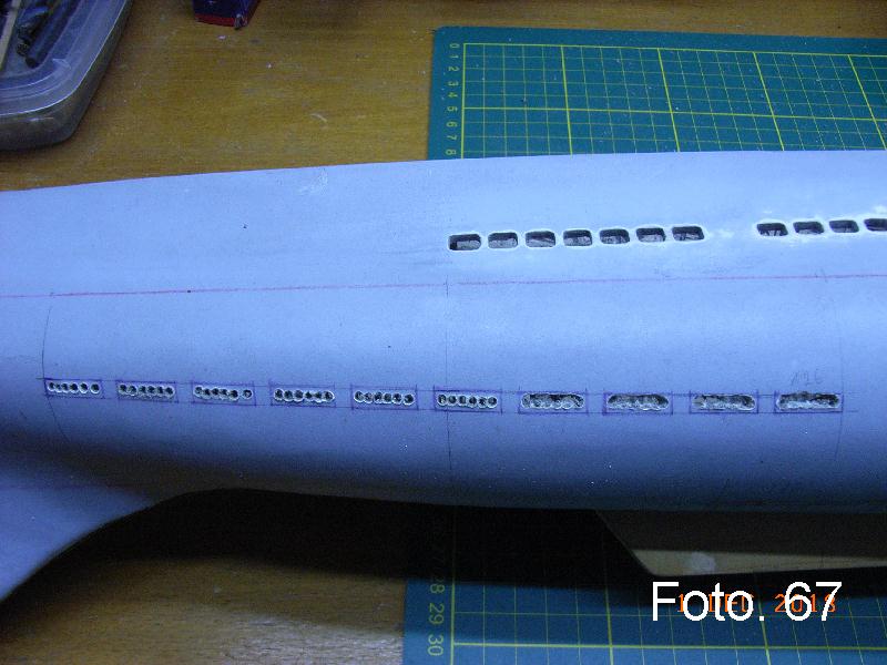 Po bardzo długiej przerwie w końcu zabrałem się za dłubanie przy modelu. Przez tak długi czas jakieś robactwo narobiło mi dziur w kadłubie. Jak na razie około pięćdziesięciu. Docelowo ma ich być 258 w całym kadłubie. , foto. 63 , 64 i 65.