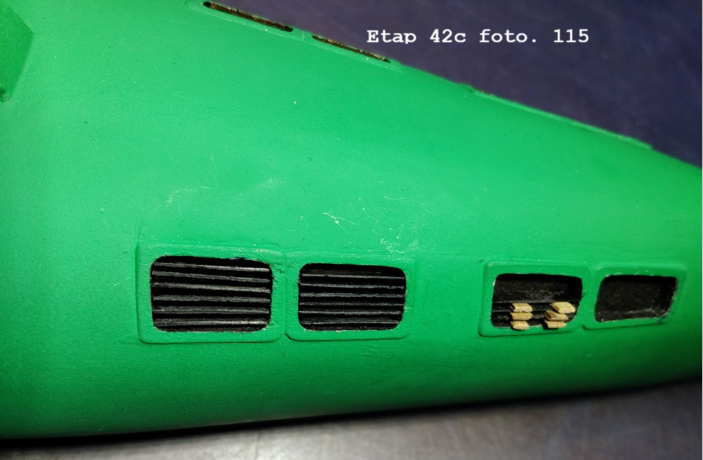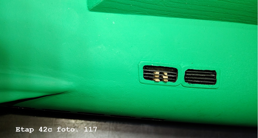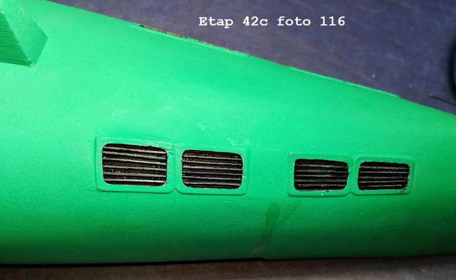 Nie wiem czy nie powinien być ciemniejszy, ale nie chciałem eksperymentować z mieszaniem farb. Teraz będzie można po wyjmować wszystkie zabezpieczenia otworów w tej części kadłuba i wkleić żaluzje.