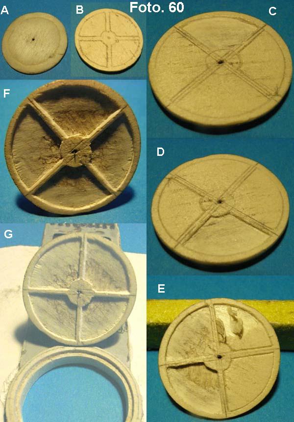 Będzie on stanowił opór dla zamkniętej pokrywy. Tak jak pierścień zasadniczy został potraktowany klejem i po wyschnięciu wyszlifowany. Plany nie precyzują czy pokrywa opiera się o czoło luku czy podczas zamykania wchodzi weń. Nie uwidocznione są też zawiasy. Postanowiłem więc że pokrywa będzie wchodziła do wewnątrz luku i będzie otwierana na zawiasach. Z tego powodu ten dodatkowy wewnętrzny pierścień. Sama pokrywa jest lekko wypukła. Do jej wykonania wykorzystałem ten sam obłóg. Dwa kwadratowe kawałki skleiłem razem krzyżując ich słoje. Po wyrysowaniu ich obwodu odciąłem nadmiar materiału dłutem pozostawiając pół milimetrowy nadmiar. Górną część ścinałem z grubsza dłutem nadając jej wypukłość od środka do krawędzi. Ostateczny kształt osiągnąłem szlifując papierem ściernym i na krawędzi pozostawiłem grubość ok. 1mm, foto. 58.