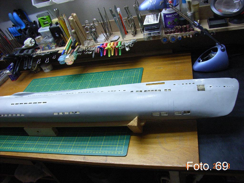 Po bardzo długiej przerwie w końcu zabrałem się za dłubanie przy modelu. Przez tak długi czas jakieś robactwo narobiło mi dziur w kadłubie. Jak na razie około pięćdziesięciu. Docelowo ma ich być 258 w całym kadłubie. , foto. 63 , 64 i 65.