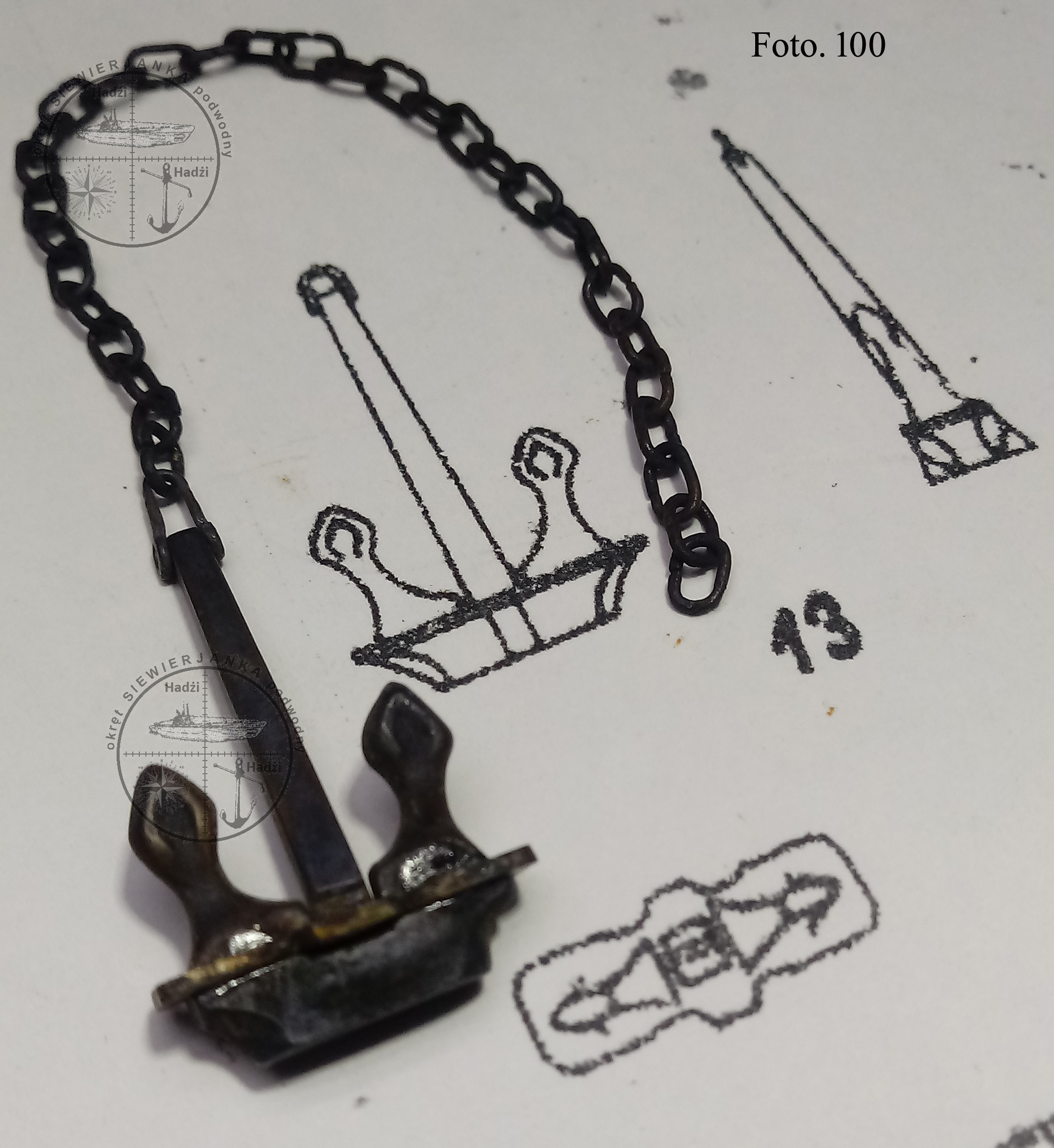 Kotwica i łańcuch zostały poczernione. Czernienia dokonał Adam „oskal”, a ja się przyglądałem jak on to robi. Ja czerniłem Unicolem, a on Bradimem po wcześniejszym zaczernieniu śladów cyny azotanem miedzi. Efekty przedstawia Foto. 100.